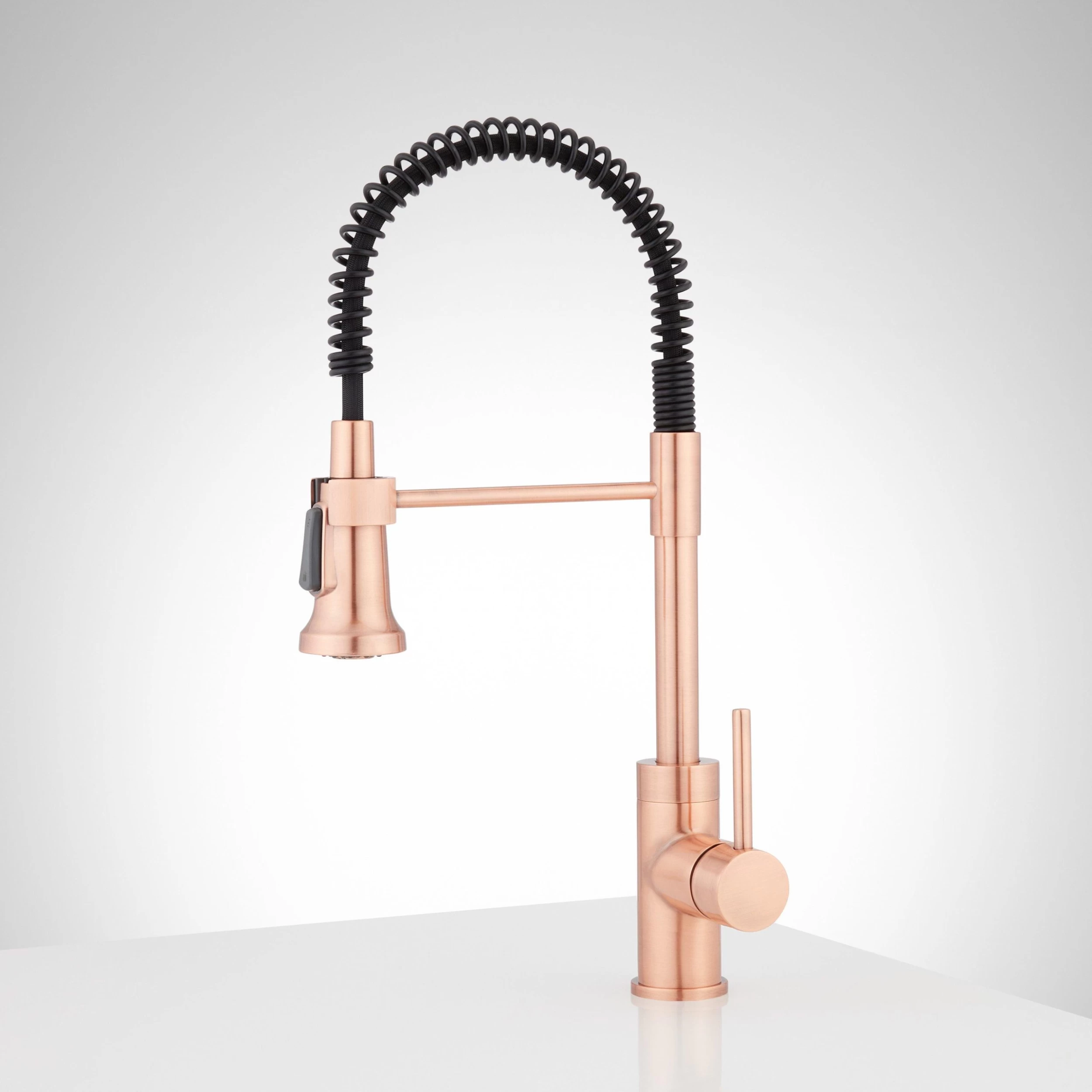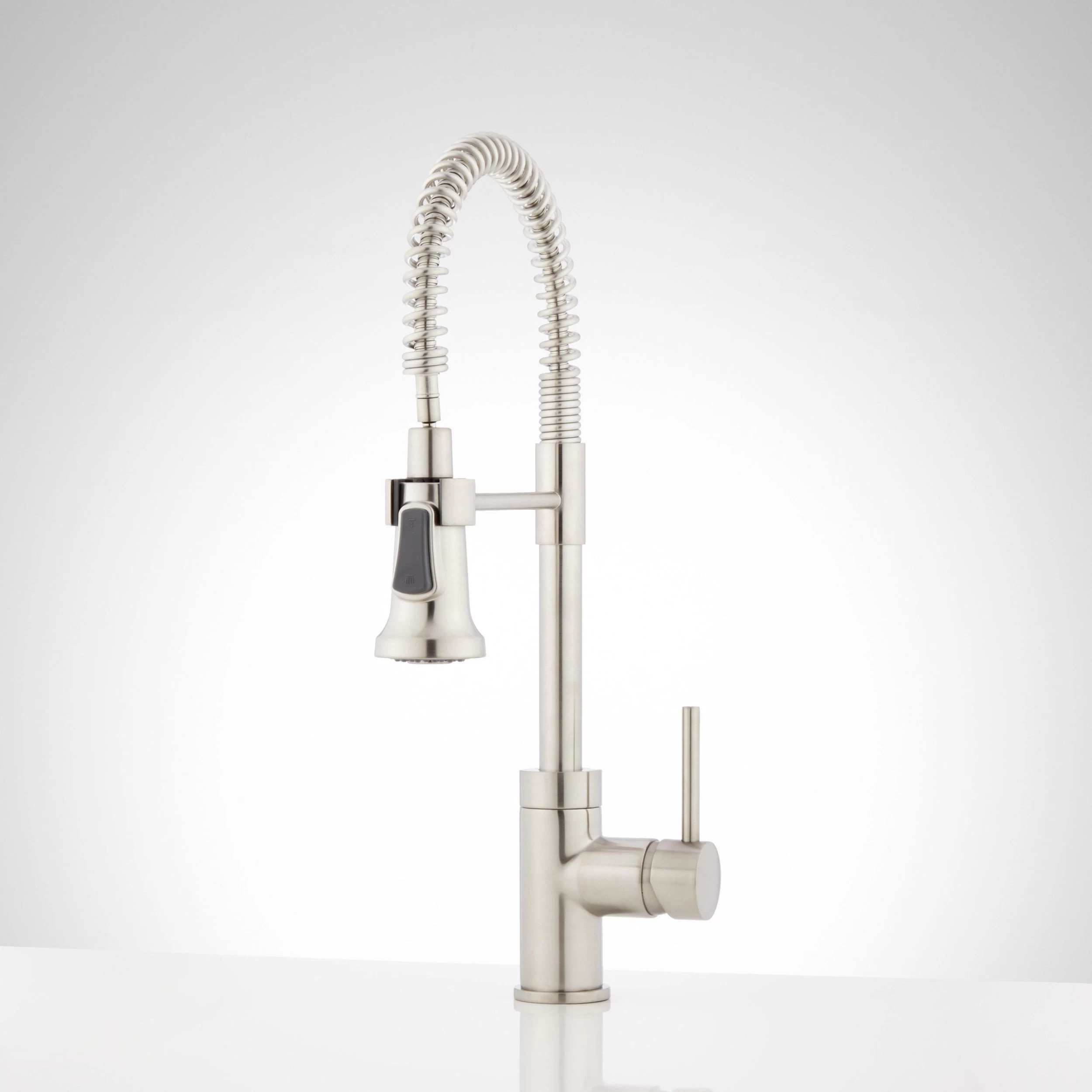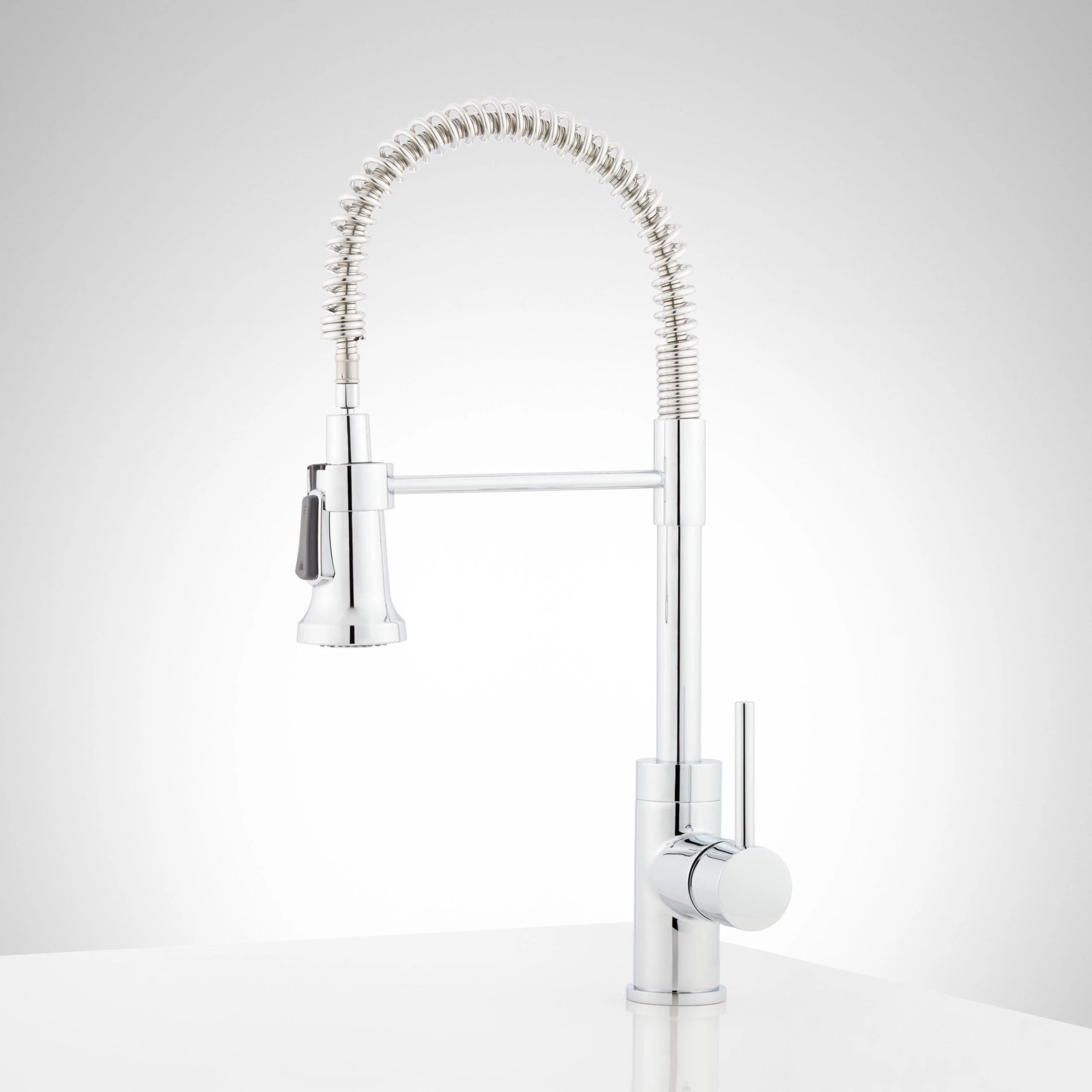 The 19″ Presidio Kitchen Faucet has a professional look and premium features. This fixture boasts a high, swooping spring spout to make cleaning and filling large pots a breeze. For those hard-to-reach areas, release the multifunction hand sprayer from its swiveling holder to help you finish the job. With durability in mind, the Presidio is made of high quality materials and has a braided, non-kink nylon hose, and a finish that’s resistant to rust and corrosion.