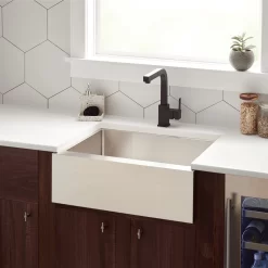 Give your kitchen a sleek update with the 24″ Hazelton Farmhouse Sink. Made of stainless steel, this product resists extreme temperatures and abrasions. The single-bowl design is perfect for accommodating plenty plates and silverware. A great fit for a busy home, this sink is heavy duty, built to last.