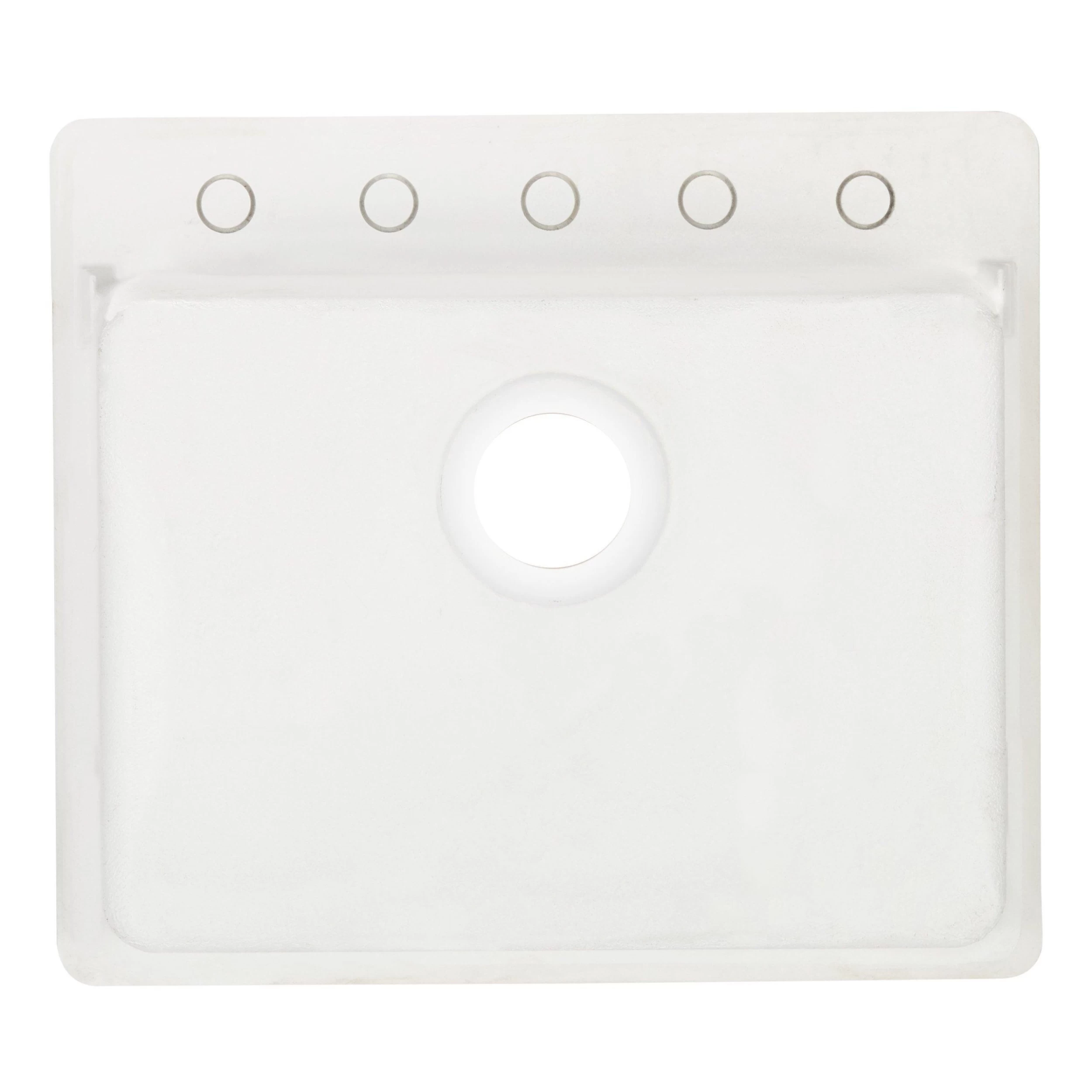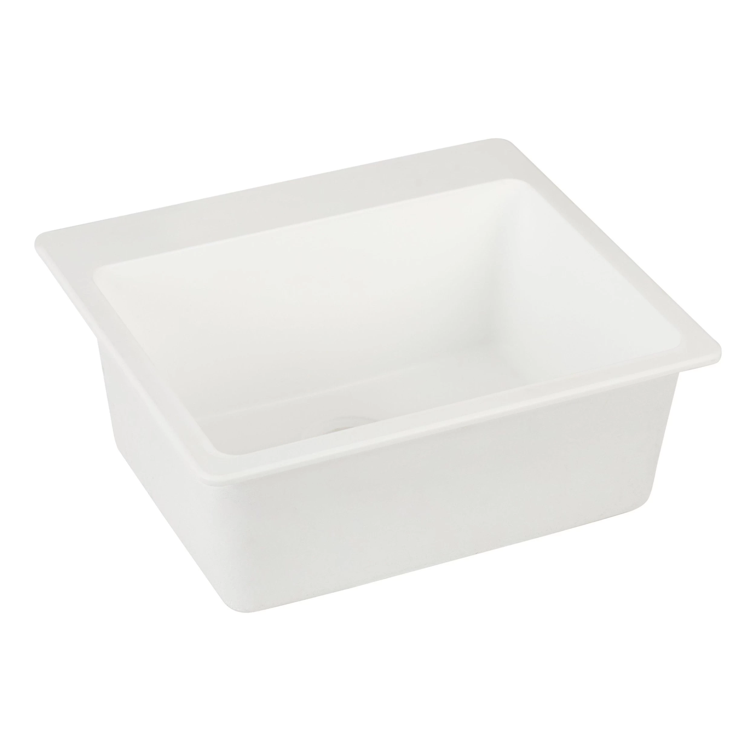 Bring style and durability to your kitchen with the 25″ Totten Granite Composite Sink in white. Designed to handle the demands of a high-traffic space, this basin is resistant to heat, scratches, and stains. A rear-center drain location provides more room for food preparation or dish cleaning without blocking the drain, as well as clearing room for storage in the cabinet below. A dual-mount design, this basin can be installed as a drop-in or undermount sink.