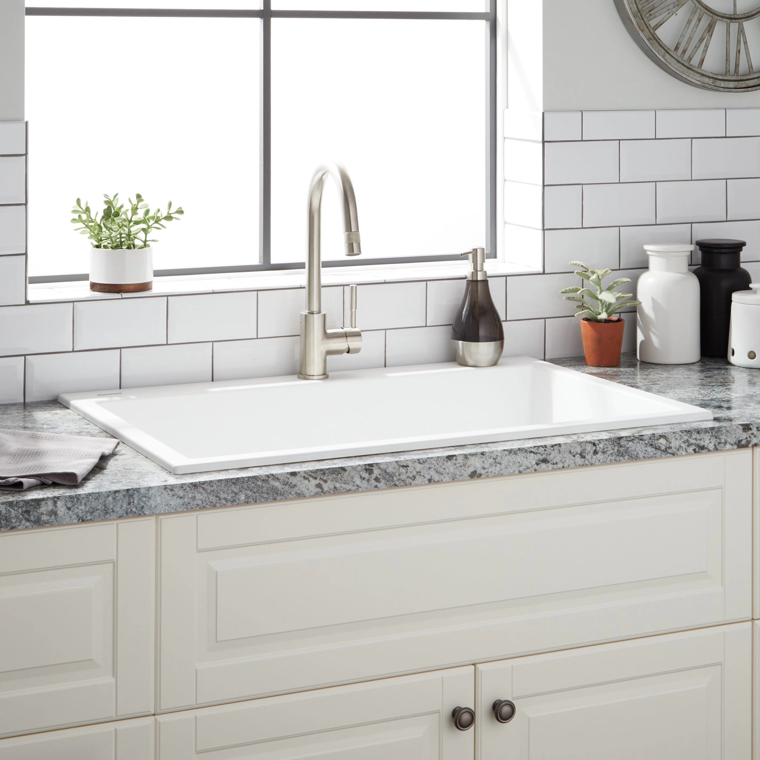 The 33″ Algren Drop-In Sink features a matte finish that offers a contemporary look for your kitchen. The granite composite material makes this product resistant to heat, dents, and scratches. The single-bowl design provides ample room for large dishes.