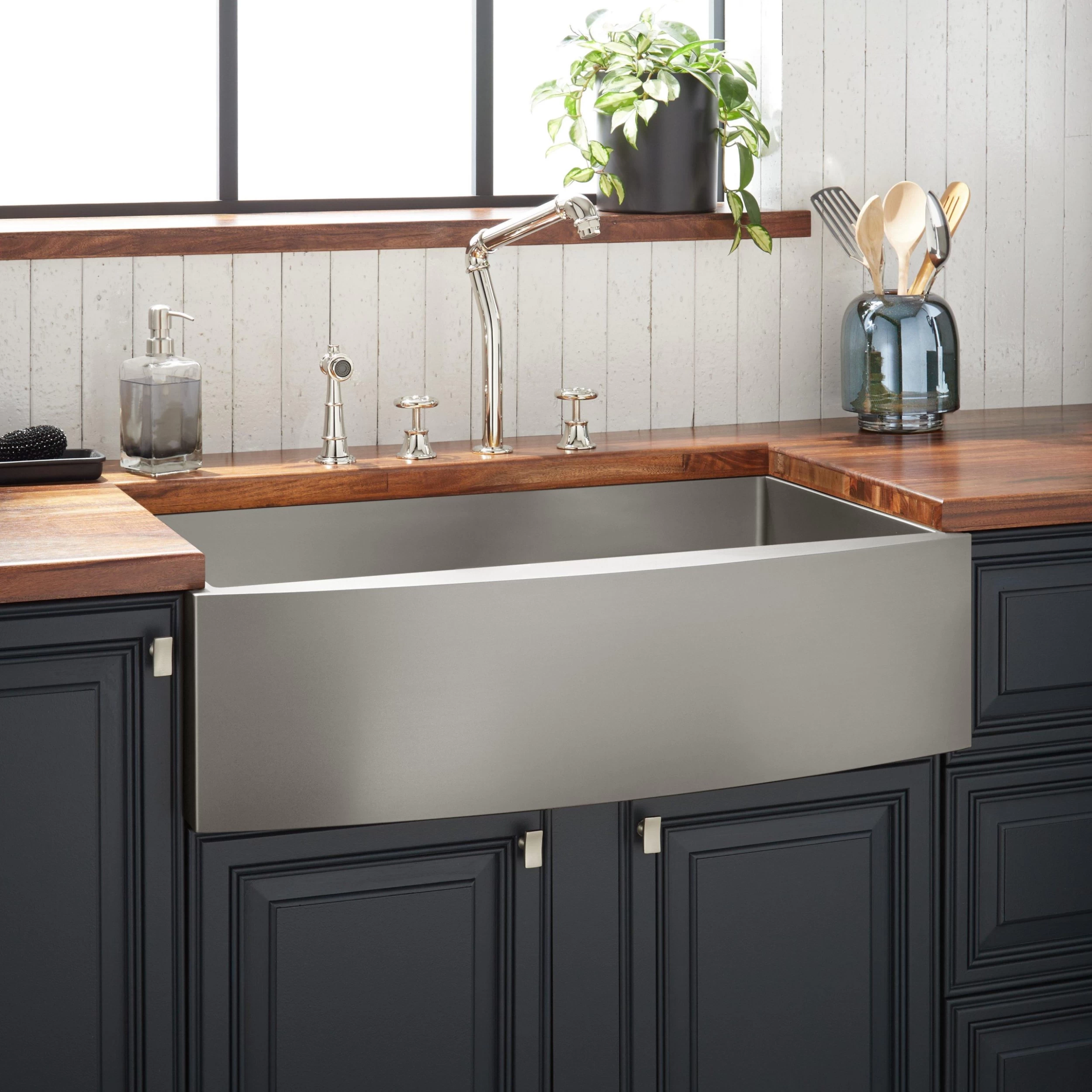 With an enduring design that includes scratch resistance, the 33″ Atlas Farmhouse Sink is ideal for an active kitchen. A large, single basin provides ample space needed for dishwashing and food preparation. Its curved apron and elegant pewter finish promises to impress your guests. Sturdy construction includes 304-grade stainless steel with a 16-gauge thickness.To protect its beauty, a coating is applied to the sink’s surface that repels water and allows blemishes to easily rub away. Outer walls are equipped with sound-absorbing pads and a thin undercoating that eliminates the risk of water damage due to condensation. Match an optional drain with your choice of faucet to complete the look.