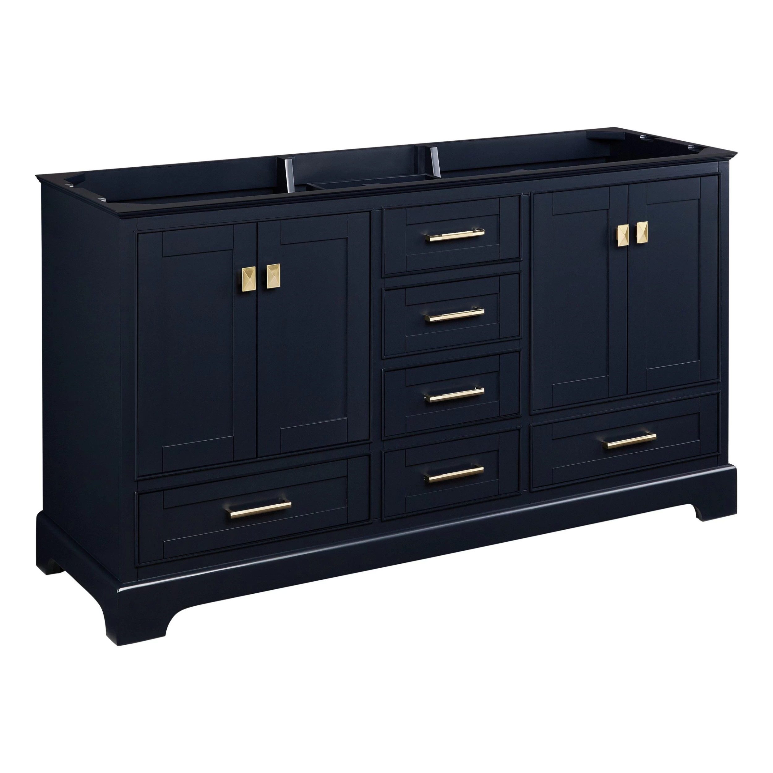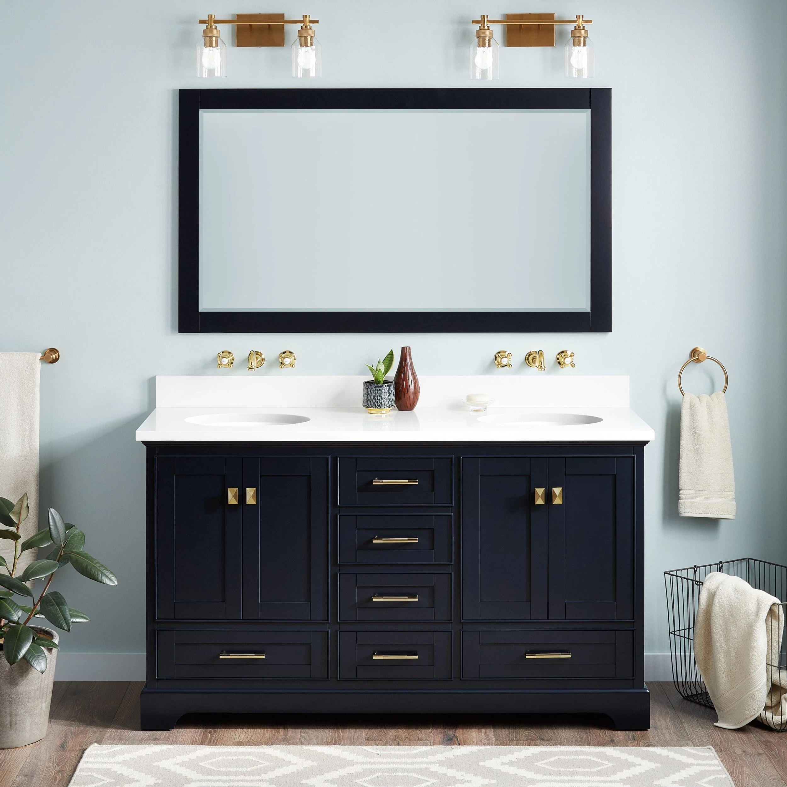 - Includes a matching backsplash and a pair of white porcelain sinks.