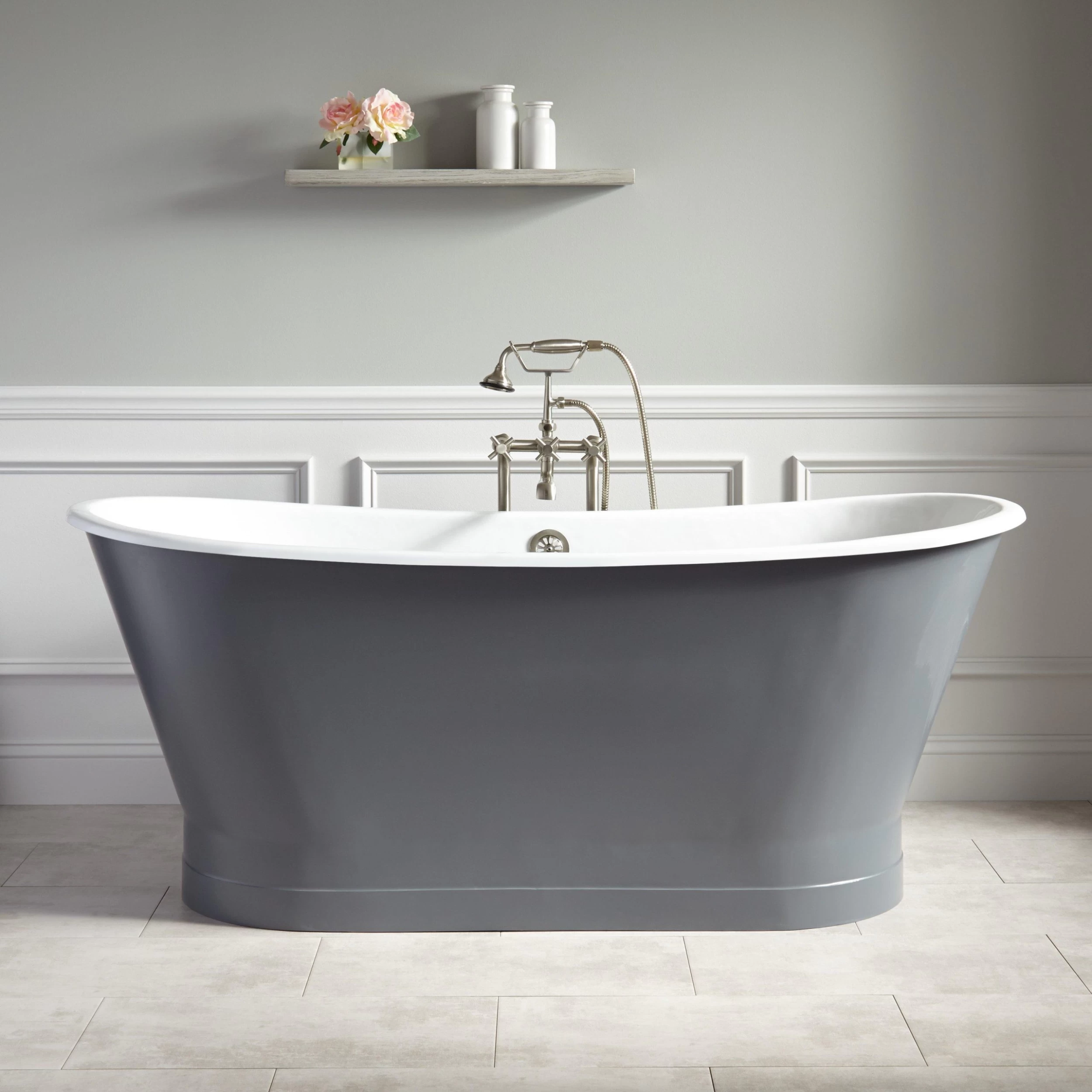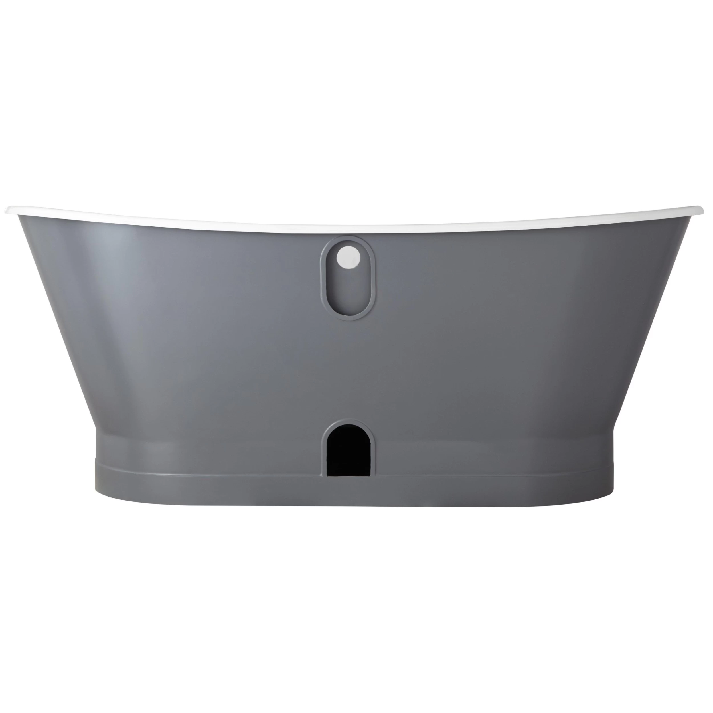 The 67″ Kateryn Bateau Cast Iron Skirted Tub combines vintage style with modern luxury. This spacious tub allows you to recline at either end. The Dark Gray color brings warmth and sophistication to your bathroom, and complements an elegant tub faucet.