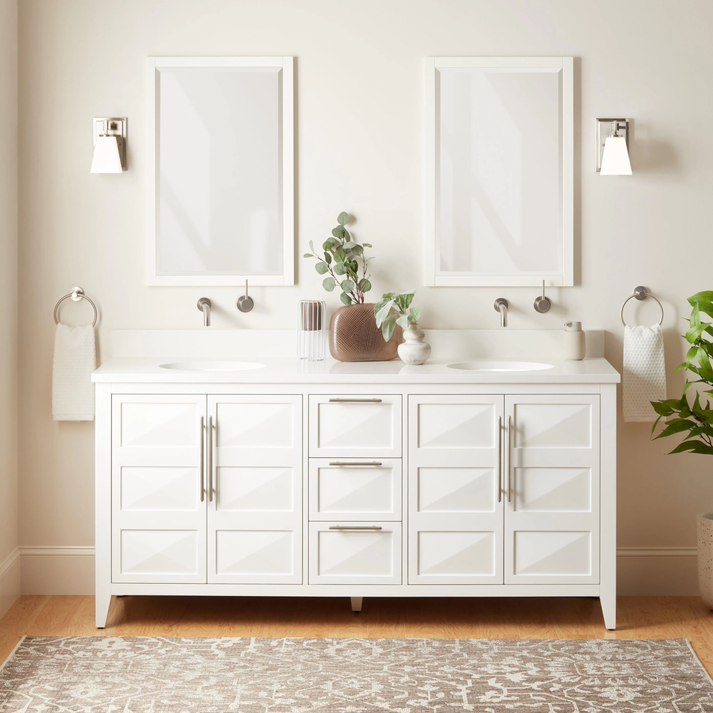 - Includes a mataching backsplash and white porcelain sinks.