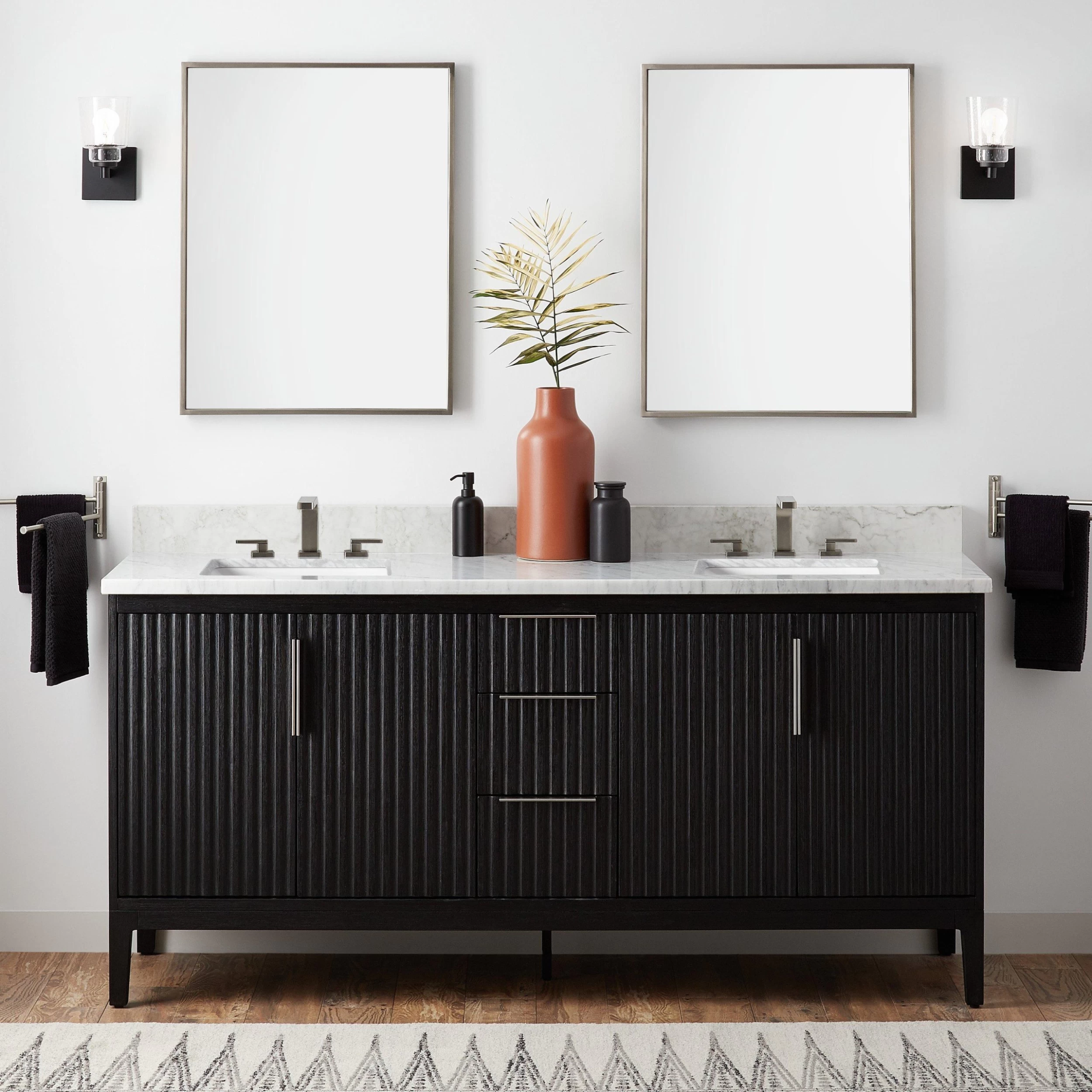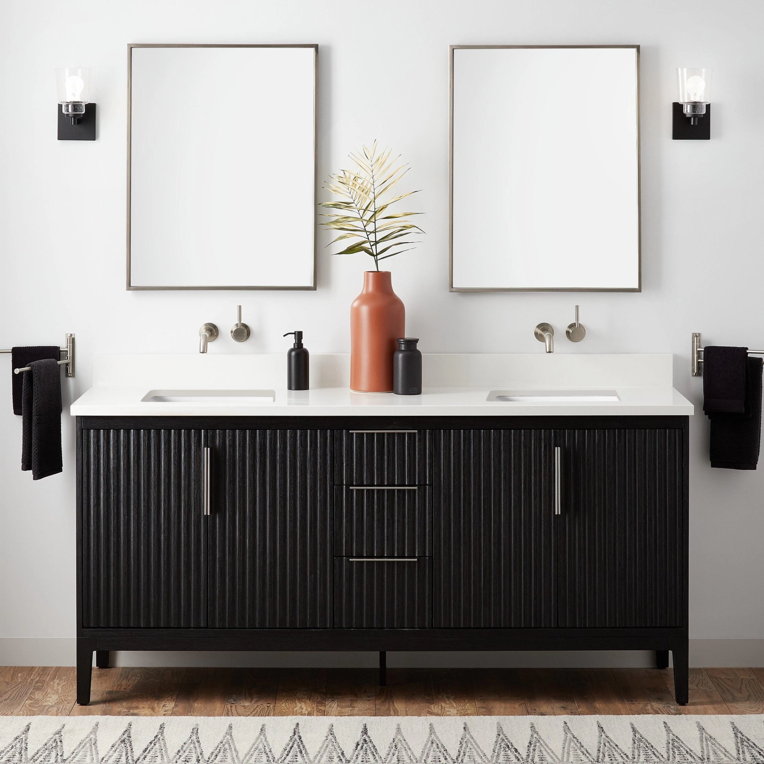 - This vanity comes with two full sets of hardware in the box – one in burnished brass and one in satin nickel.