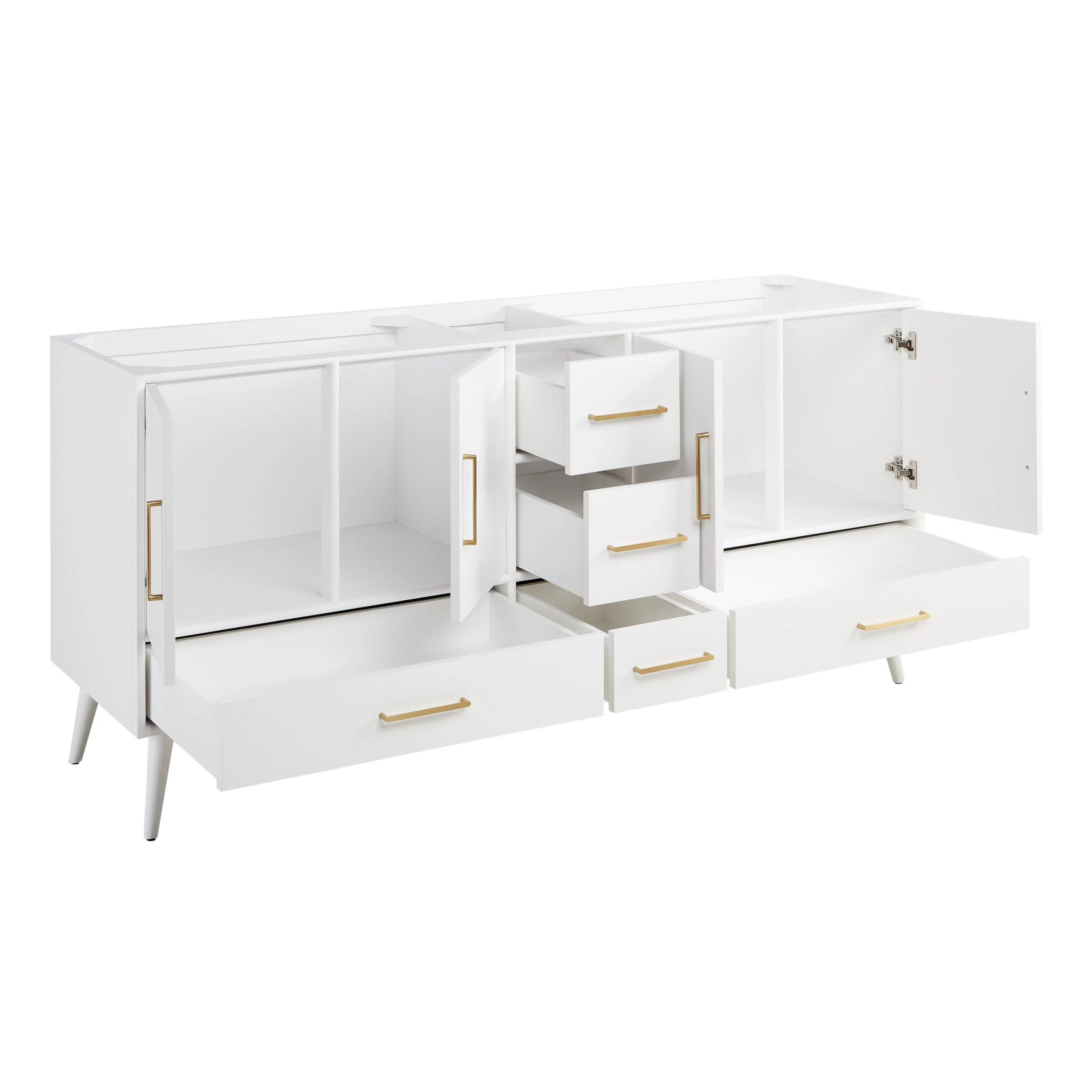 - Includes a matching backsplash and white porcelain sinks.