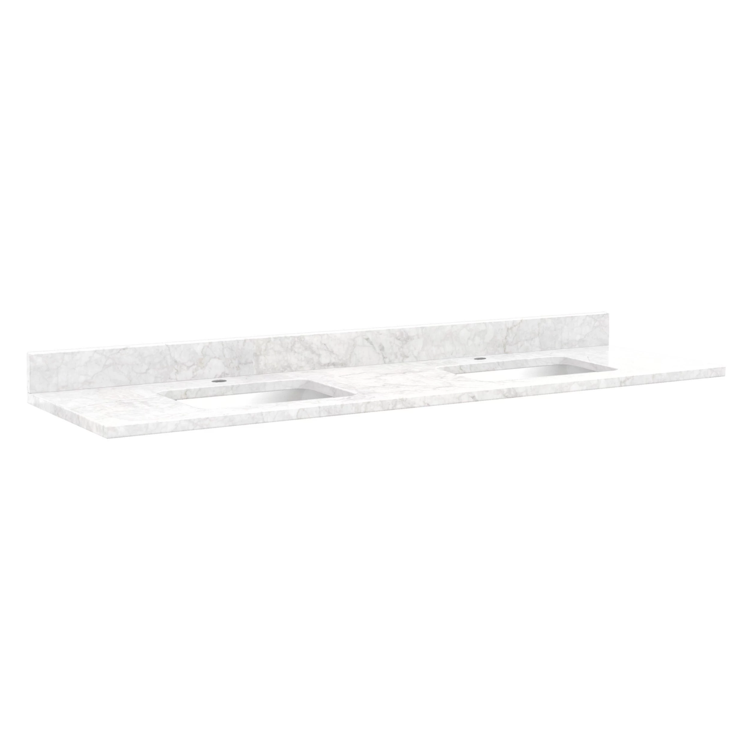 - Includes marble countertop, backsplash, and two white porcelain sinks.