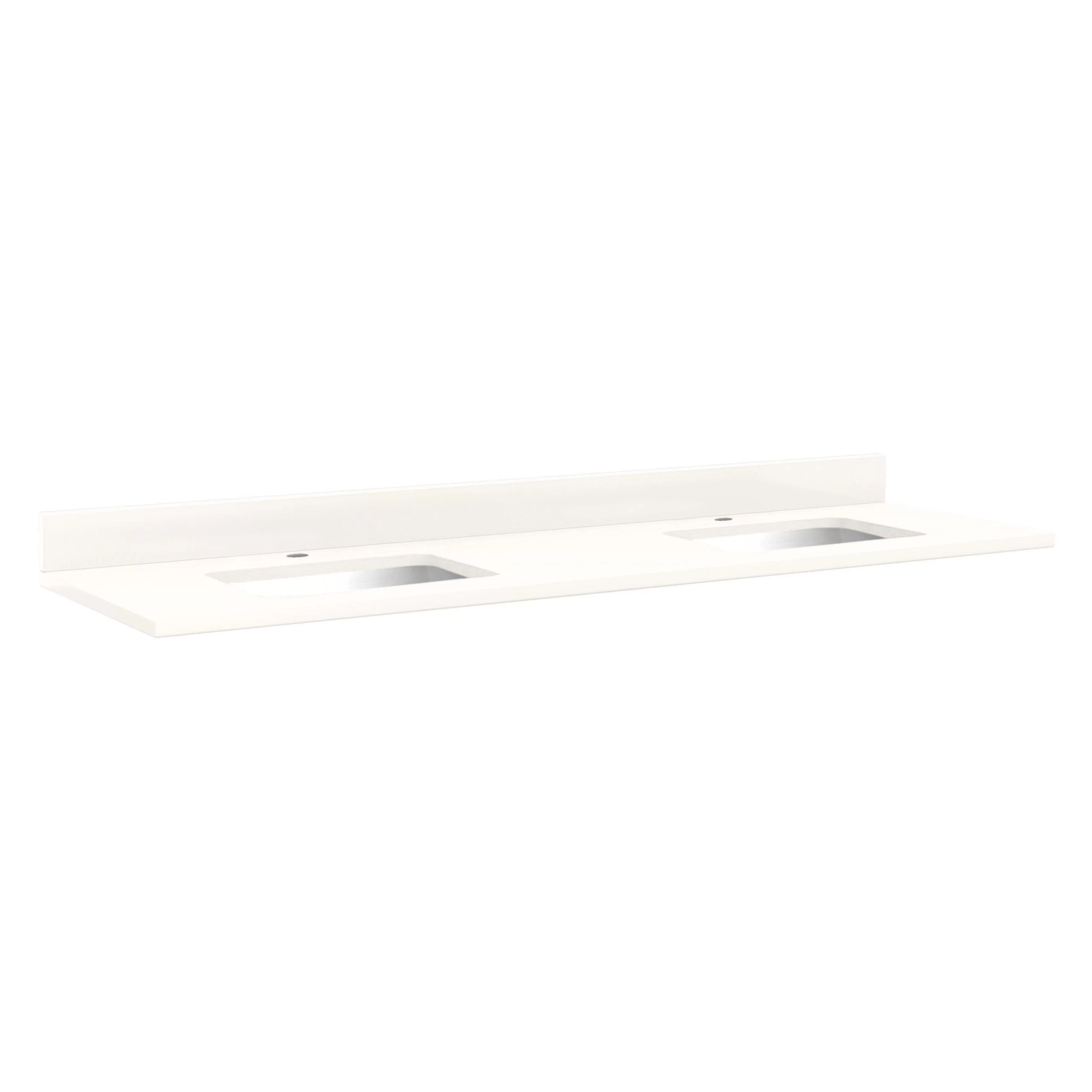 - Includes quartz countertop, backsplash, and two white porcelain sinks.