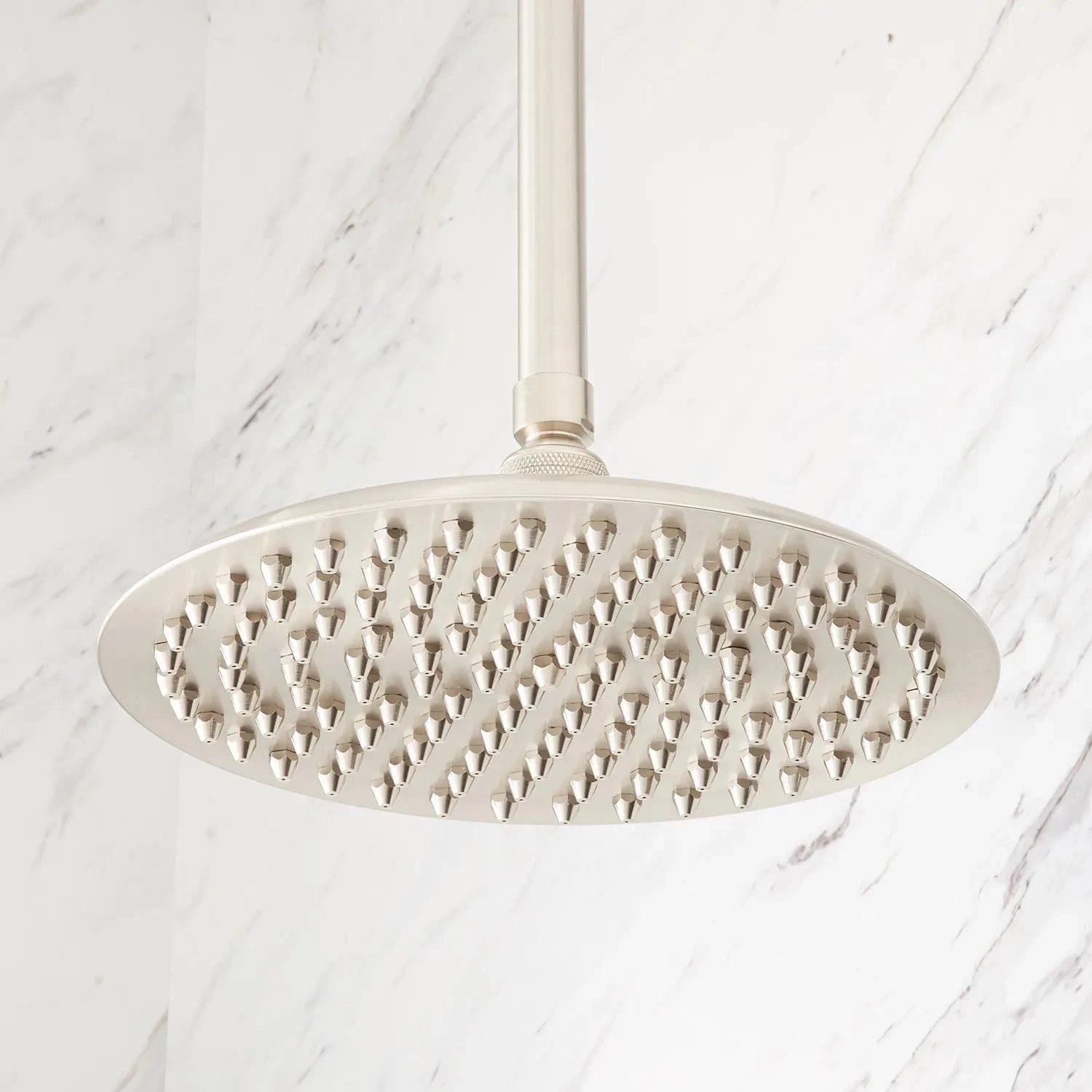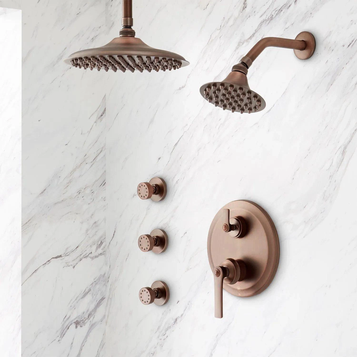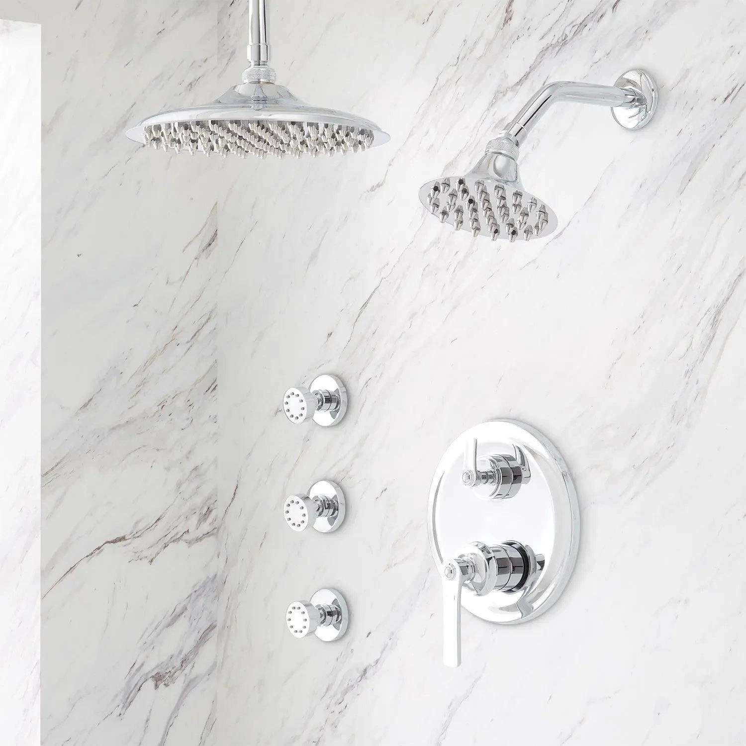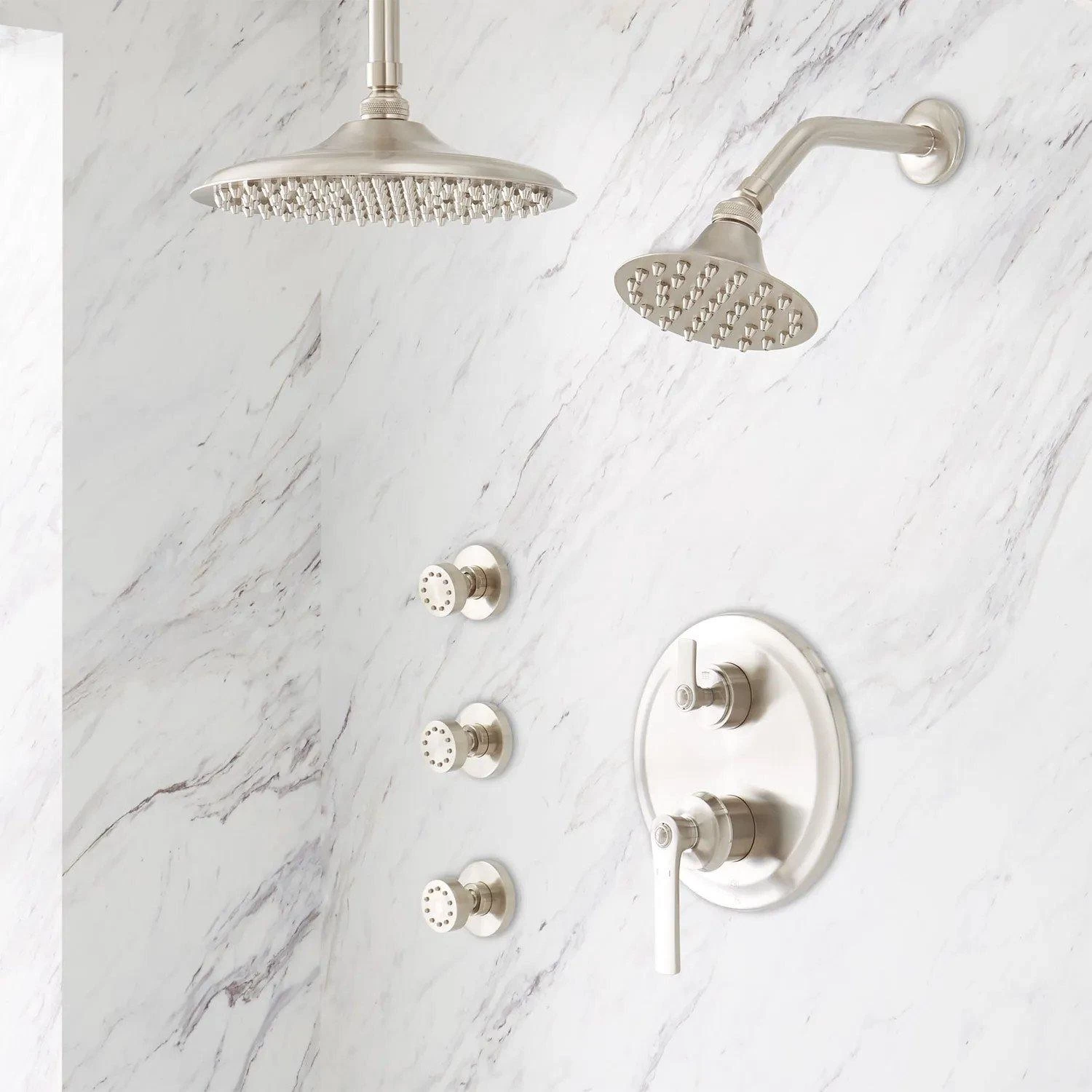 - Shower system includes ceiling-mount rainfall shower head, wall shower head, 3 body sprays, and a 3-way in-wall pressure balance diverter.