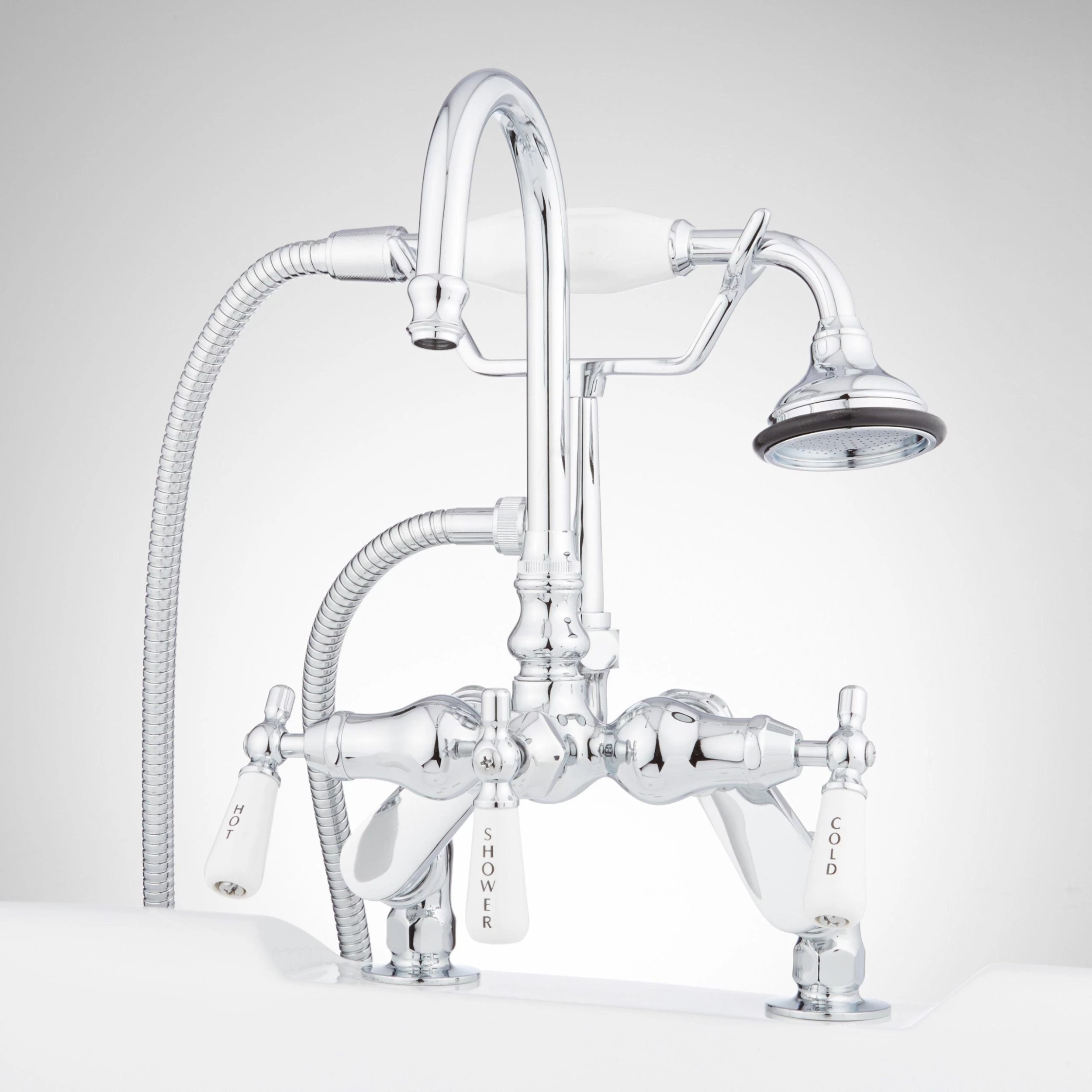 This stunning leg tub Faucet and Hand-held shower fits easily on any tub rim and features an elegant gooseneck spout.