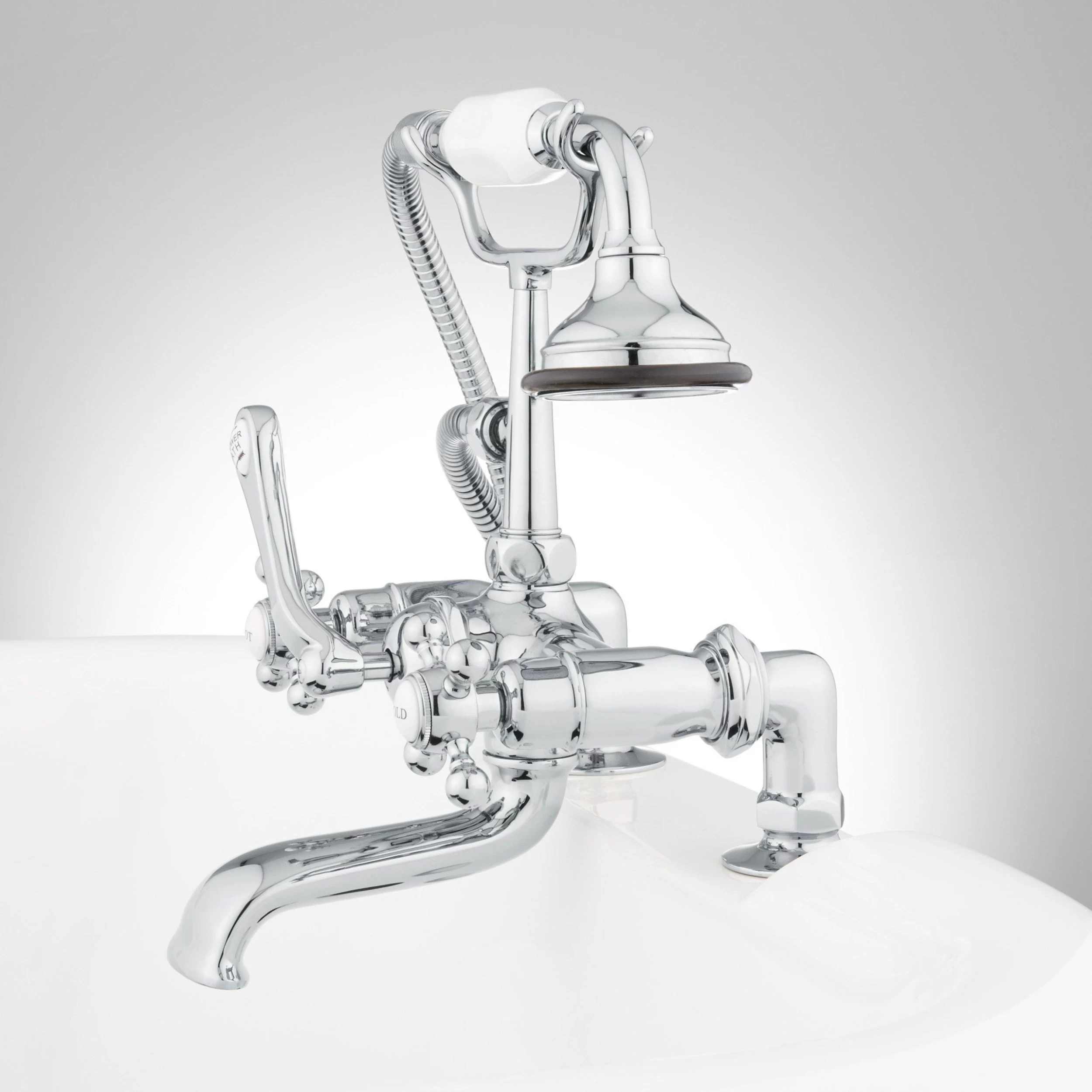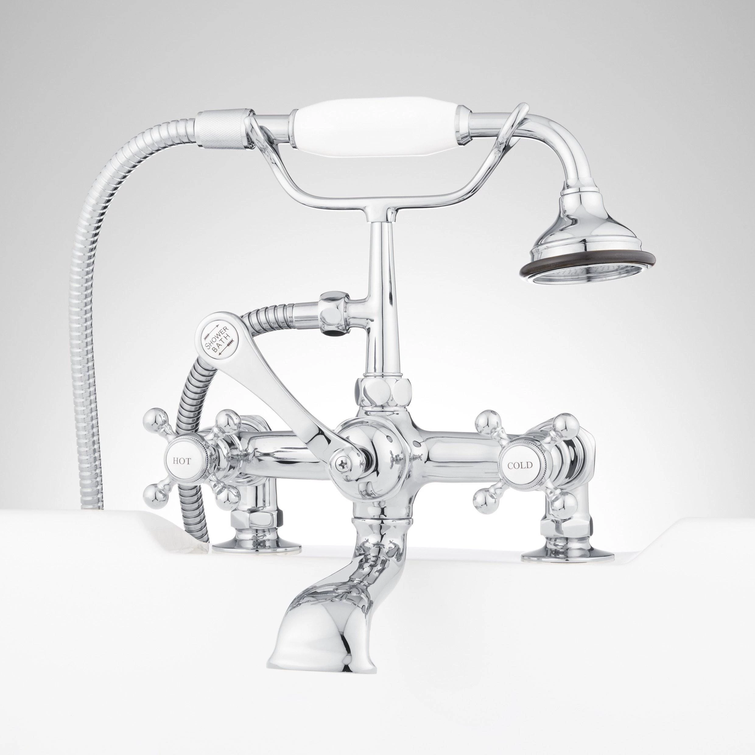 The Deck-Mount Tub Faucet with Hand Shower brings nostalgic charm to your bathroom. This tub faucet features a hand shower and porcelain accents, creating a beautiful profile.