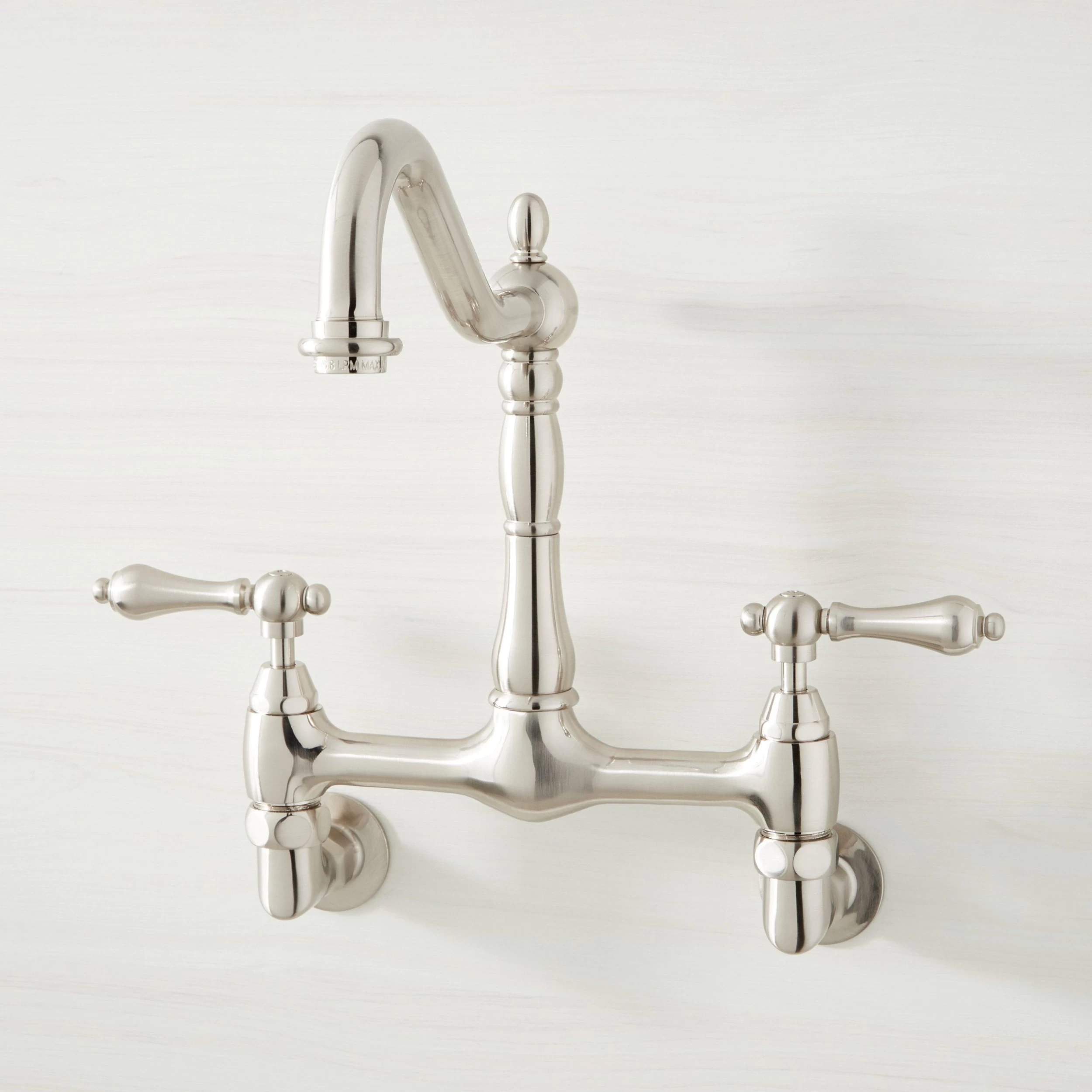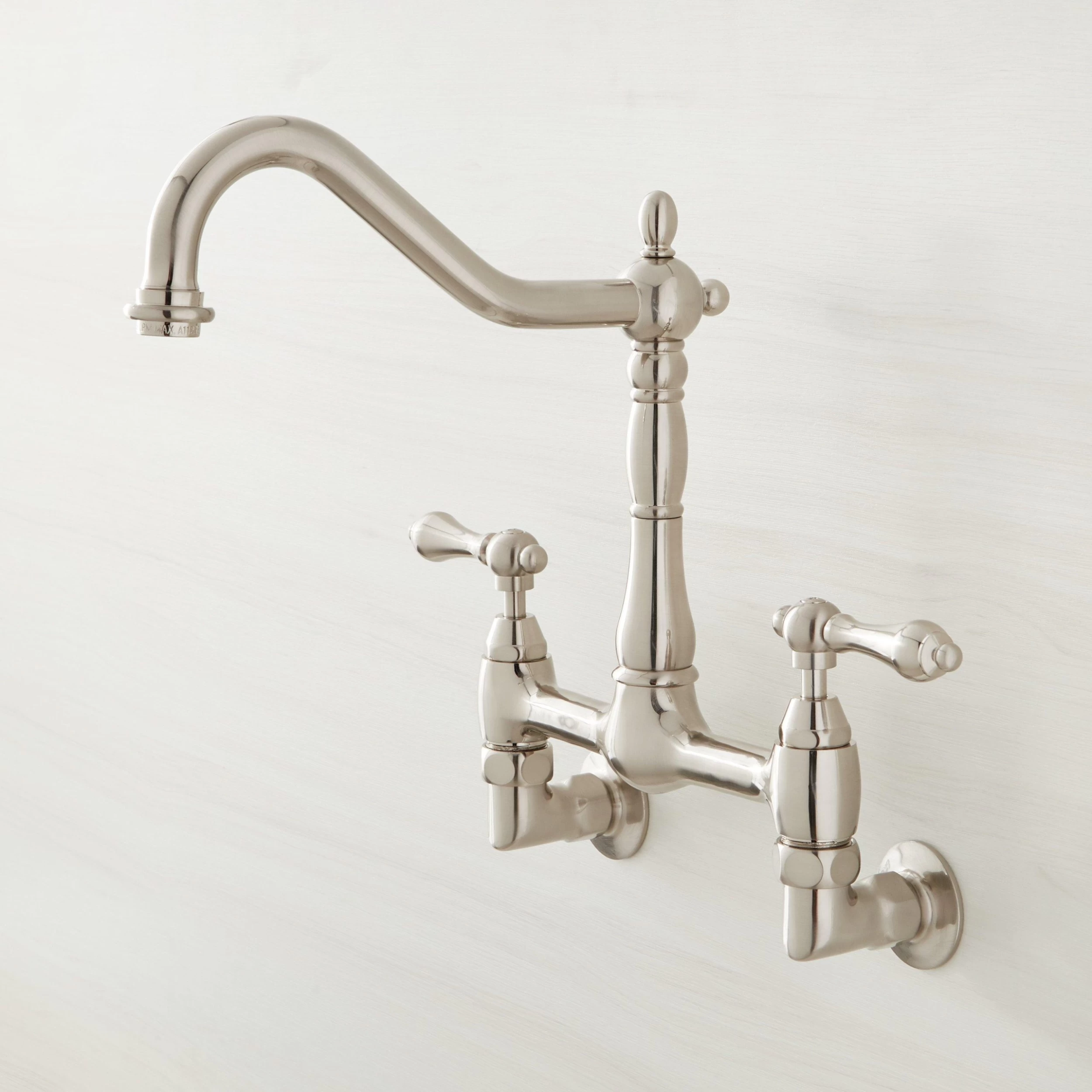Featuring shapely metal lever handles and a shapely pillar with finial, this wall-mount faucet will be a beautiful addition to any kitchen.