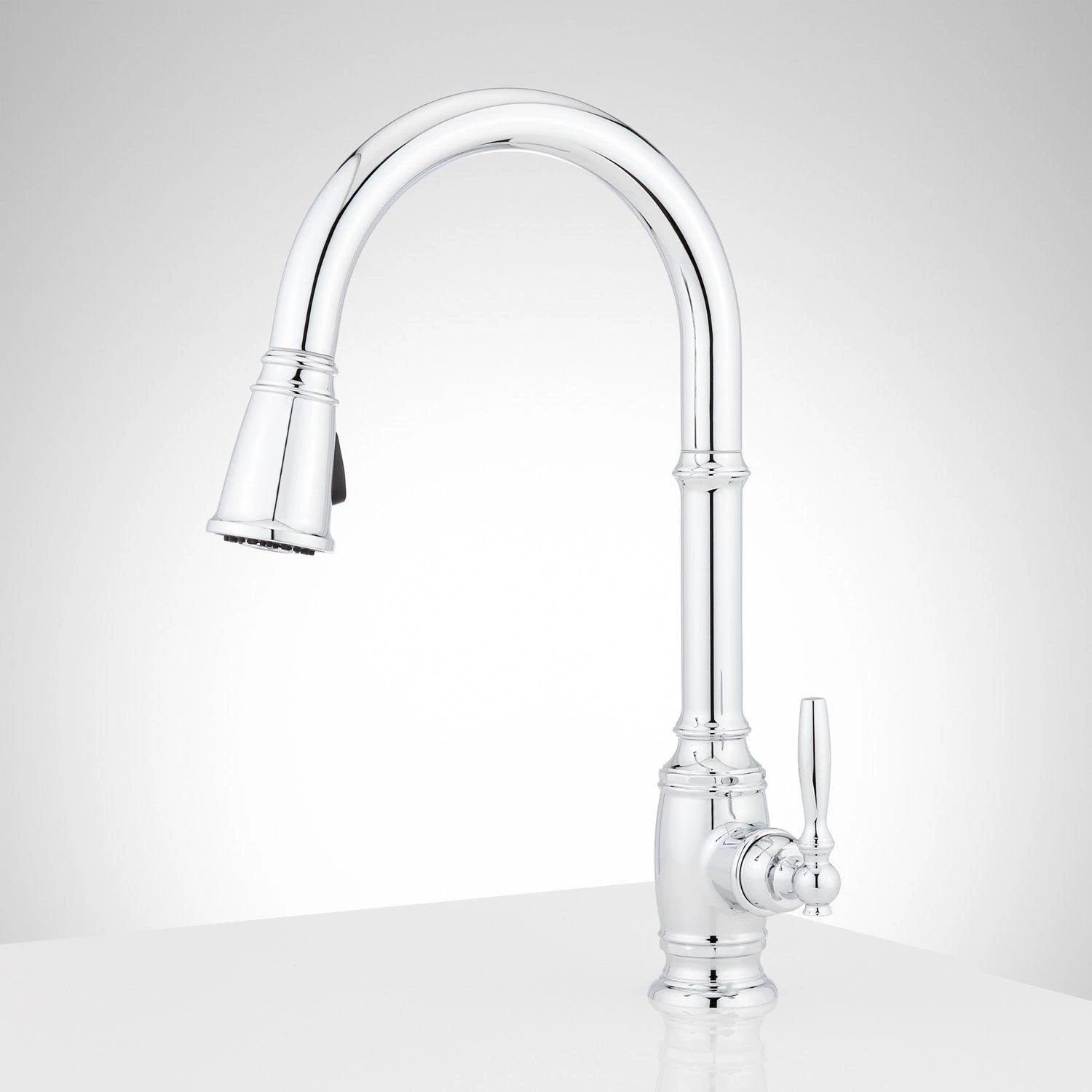 Give your kitchen the ultimate traditional centerpiece with the Finnian Pull-Down Faucet. Equal parts stylish and functional, its high-arch, gooseneck silhouette offers plenty of clearance for larger pots and pans. To make dishwashing and food prep even easier, its two-function sprayer allows you to switch between an aerated stream and a powerful spray while a single lever handle controls both water pressure and temperature. Additionally, its pull-down head makes rinsing hard-to-reach areas of your sink a breeze. Choose your favorite finish to complement existing decor.