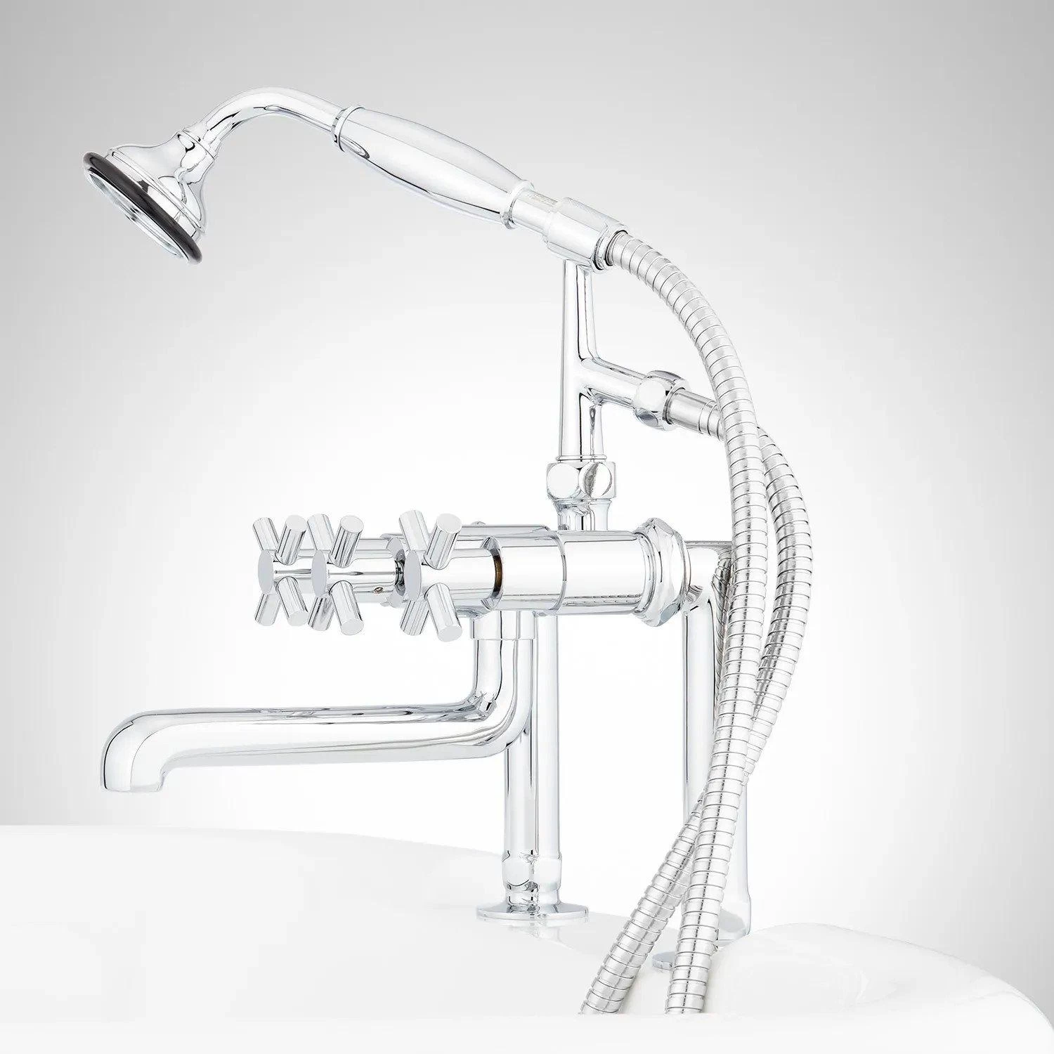 - Includes faucet, deck-mount couplers, hand shower and cradle.