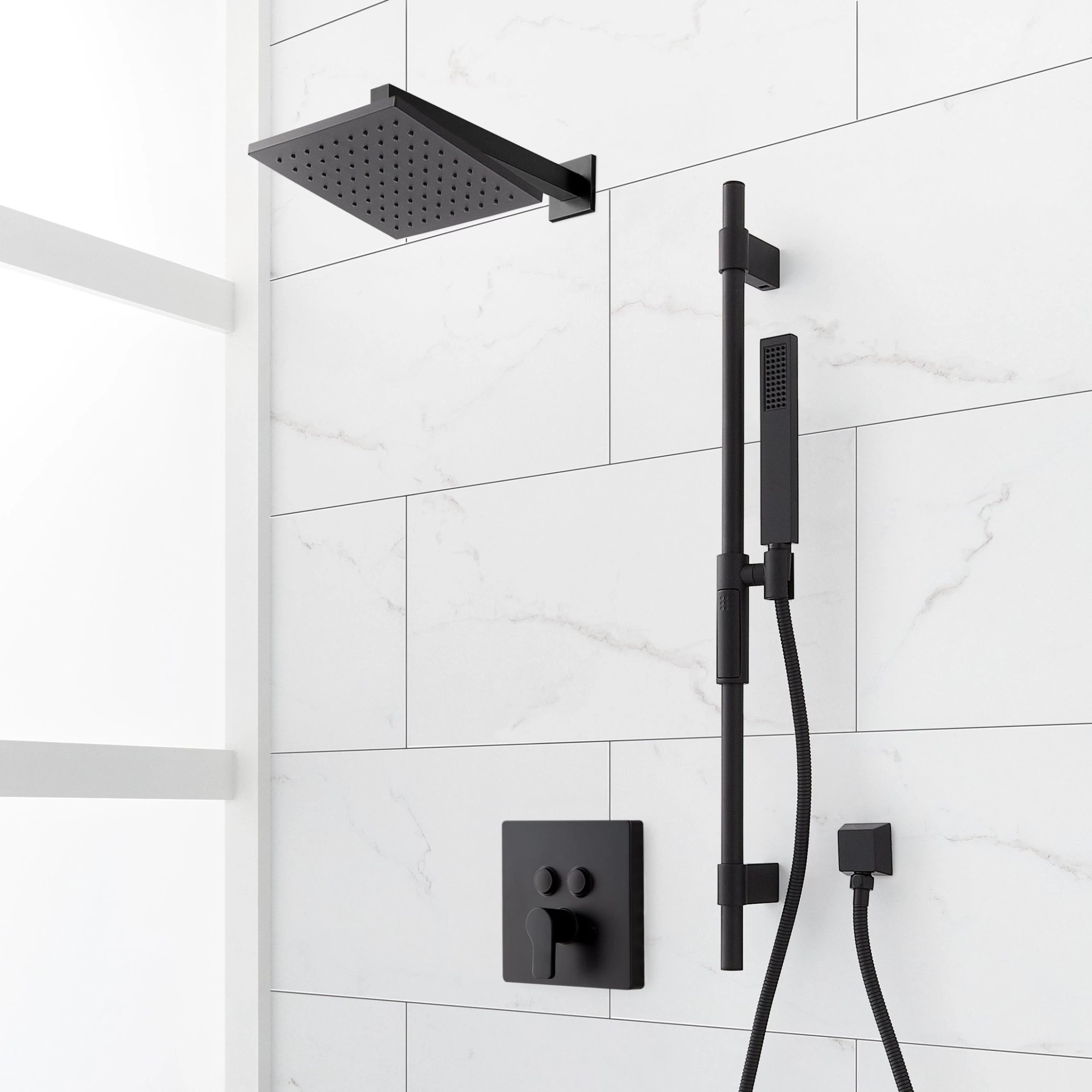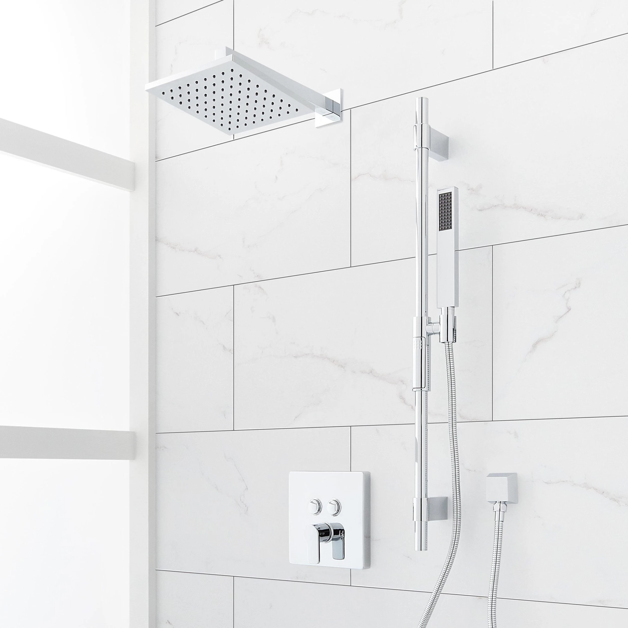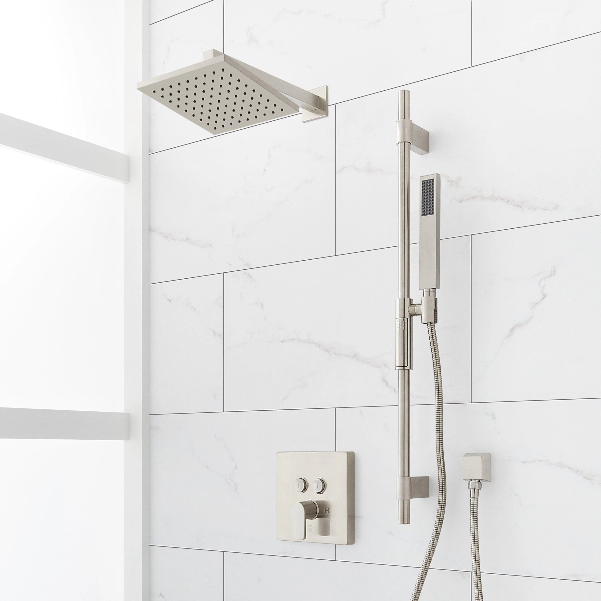 - Shower system includes wall mount shower head and arm, wall mount slide bar with hand shower and hose, hand shower water connection, and a pressure balanced valve with 2-way diverter.