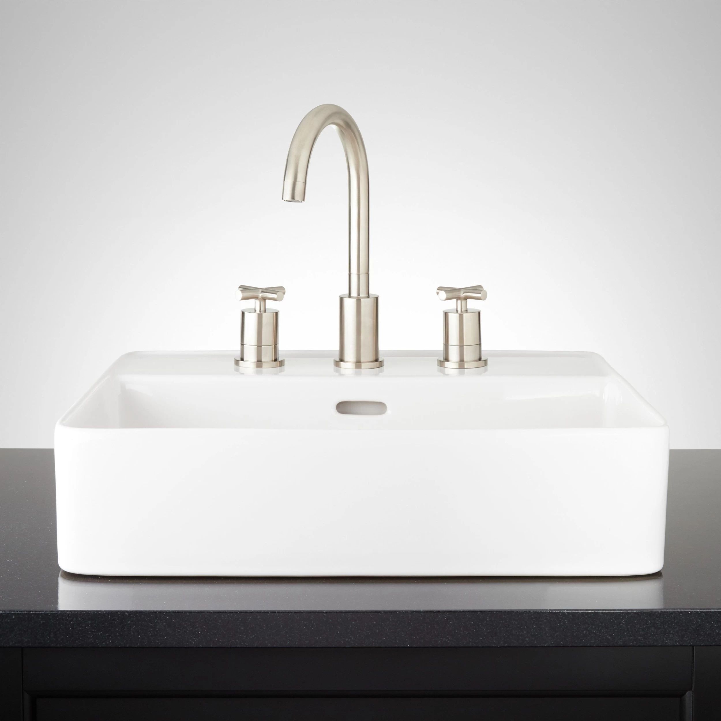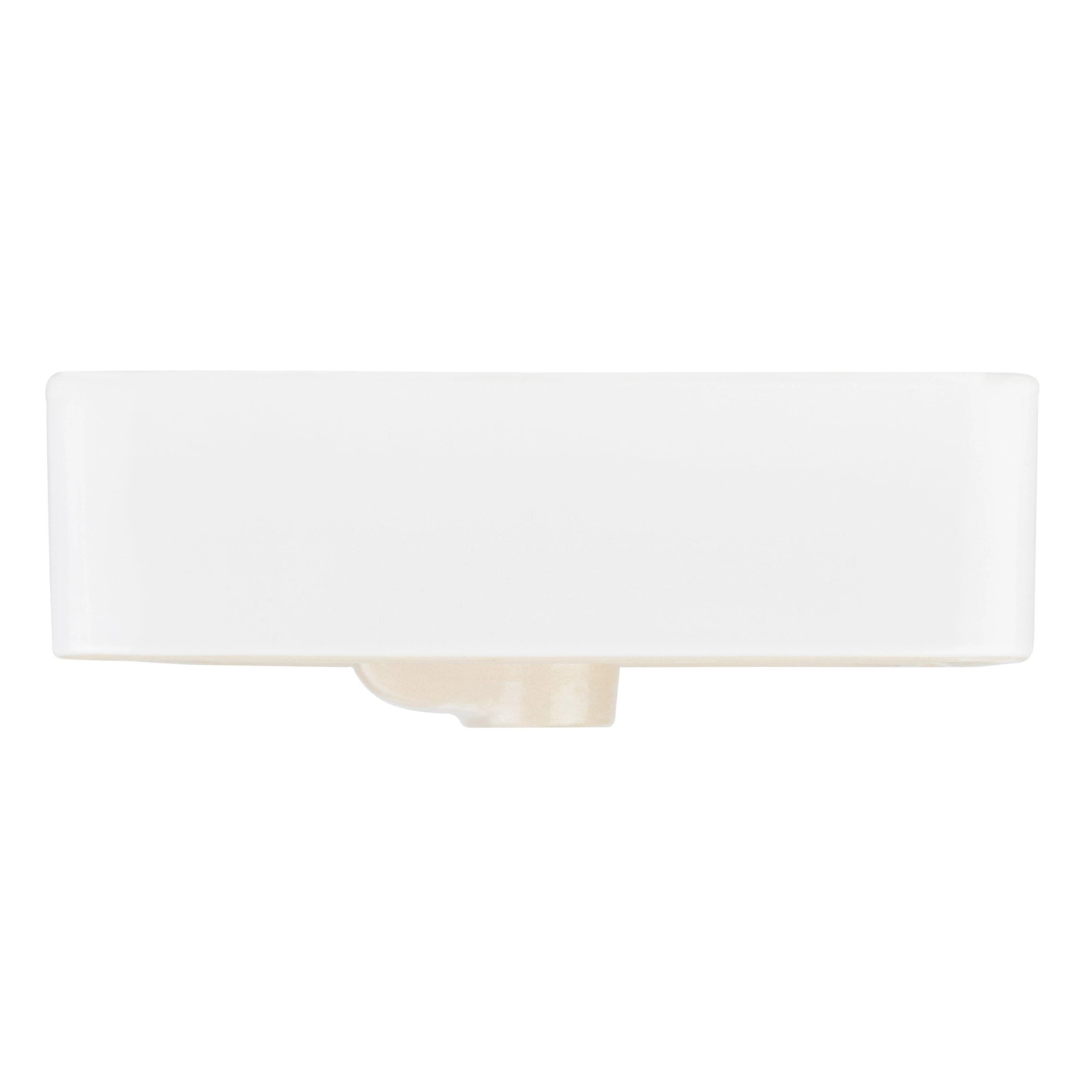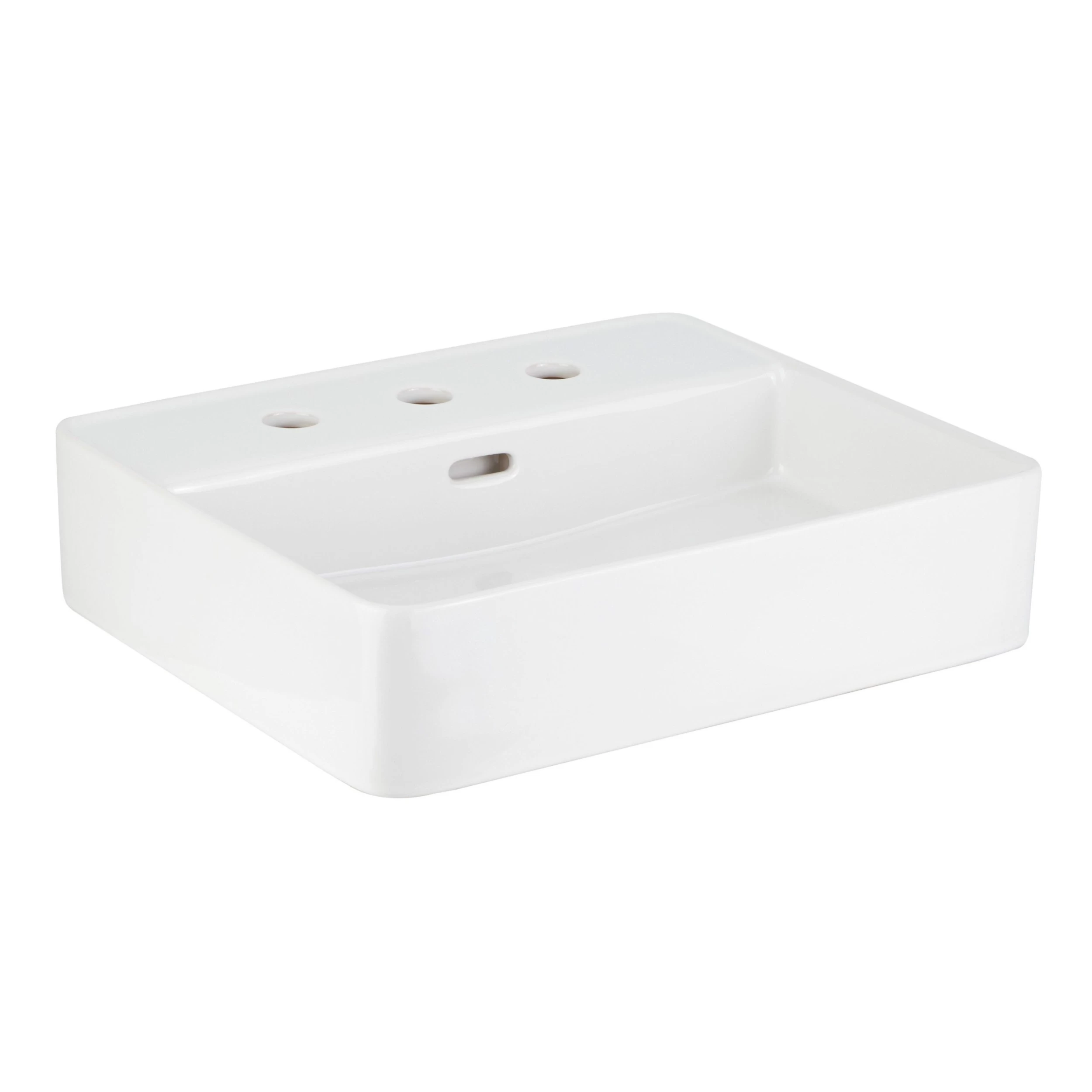 This Hibiscus Rectangular Vessel Sink enhances any bathroom with sleek, modern style. It’s crafted from durable fireclay for excellent resistance to cracks, chips, and stains, and it has an overflow to prevent spills. This smoothly enameled, white sink has a bowl depth of 3-1/2″ and comes pre-drilled for an 8″ widespread faucet of your choosing.