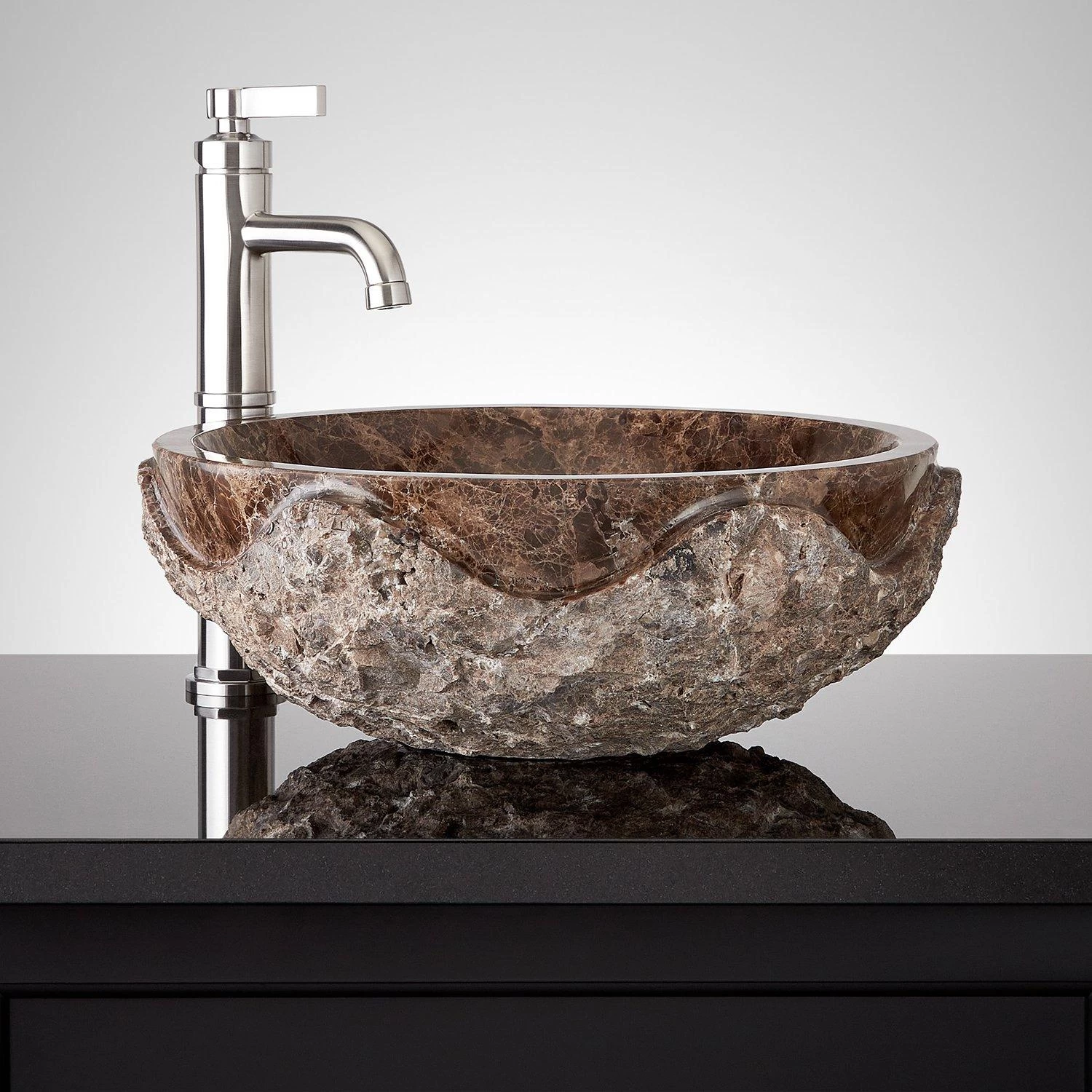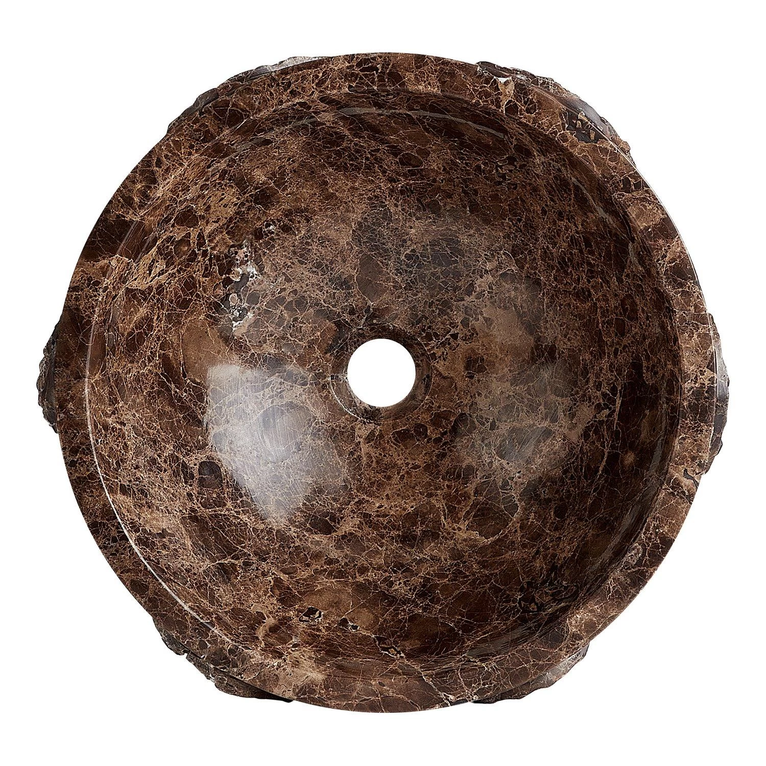 Bring textural drama to your bathroom with the Hull Round Marble Vessel Sink. Crafted from Dark Emperador marble, the smooth interior of the sink features a rich black tone which also beautifully highlights the material’s unique veining. This effect of the interior spills over the edge for a bespoke look, ultimately leading to a rugged, chiseled exterior. Pair with a sleek vessel or wall-mount faucet for a high-impact look.