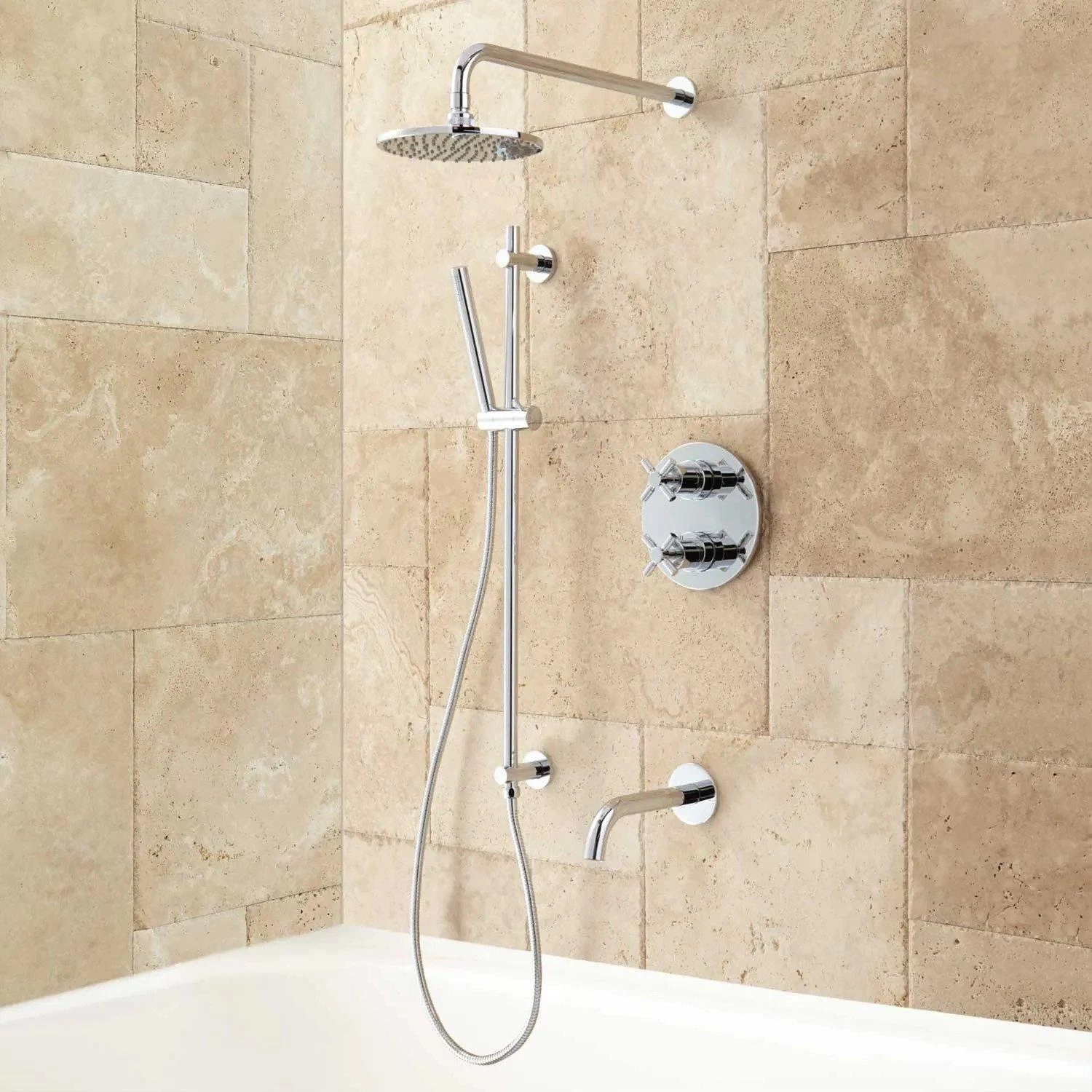 - Shower system includes wall mount rainfall shower head, wall mount slide bar with hand shower, hand shower water connection, tub spout and a thermostatic 3-way in-wall diverter.