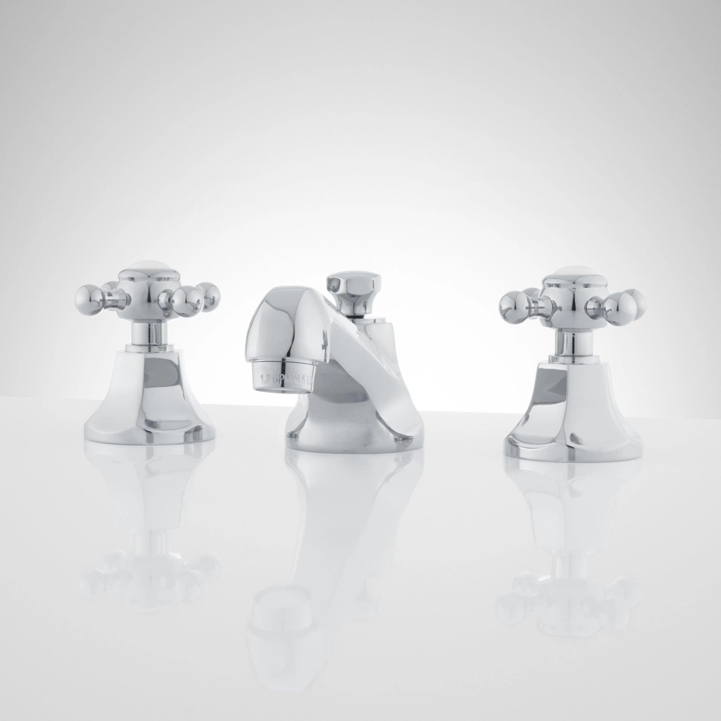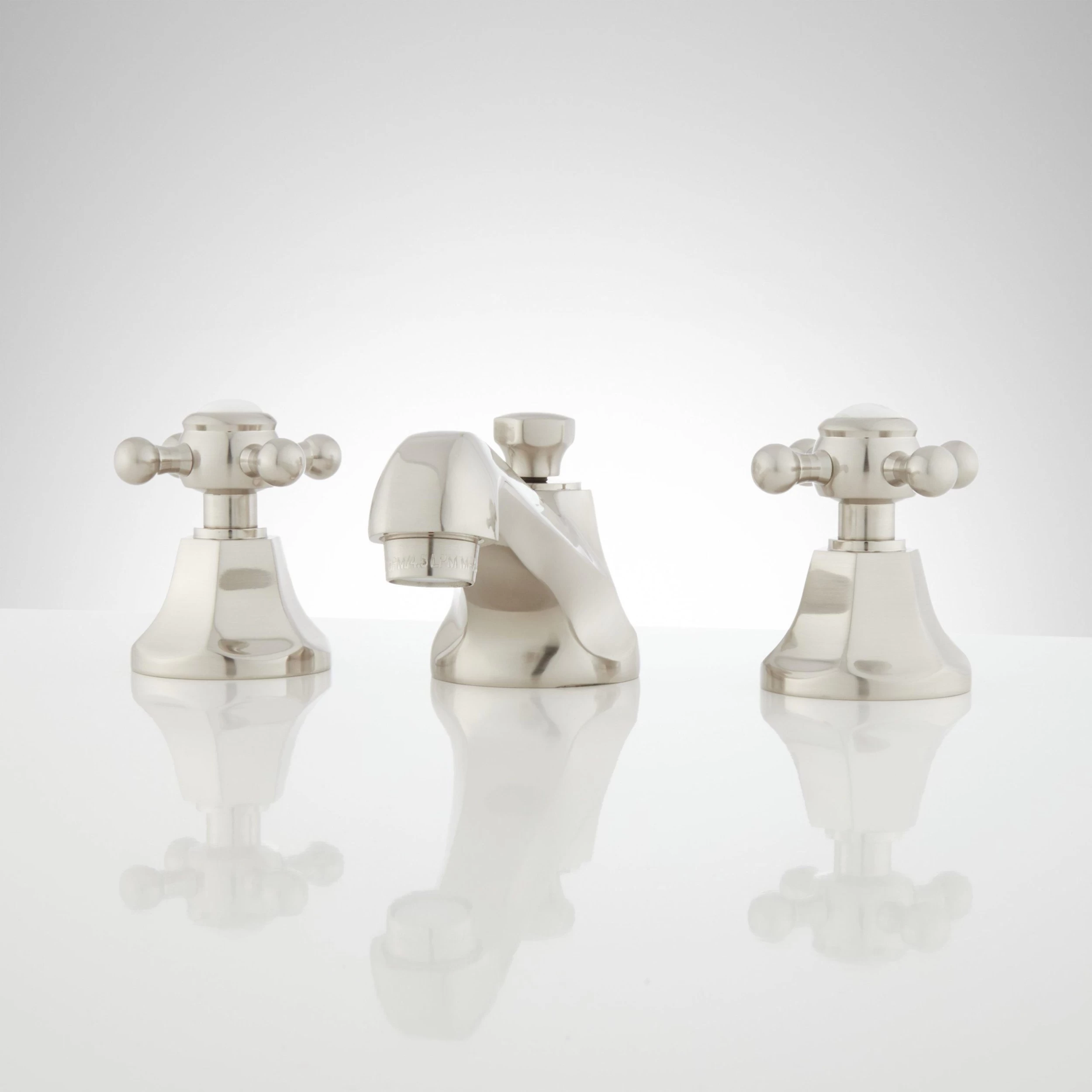 This widespread lavatory faucet features cross handles with porcelain insets and has adjustable centers for maximum flexibility.