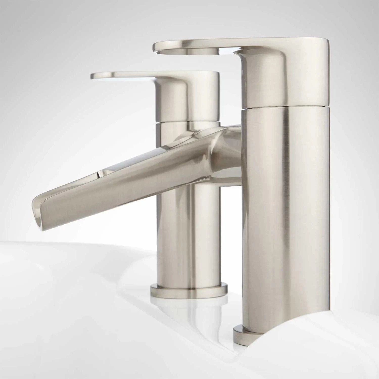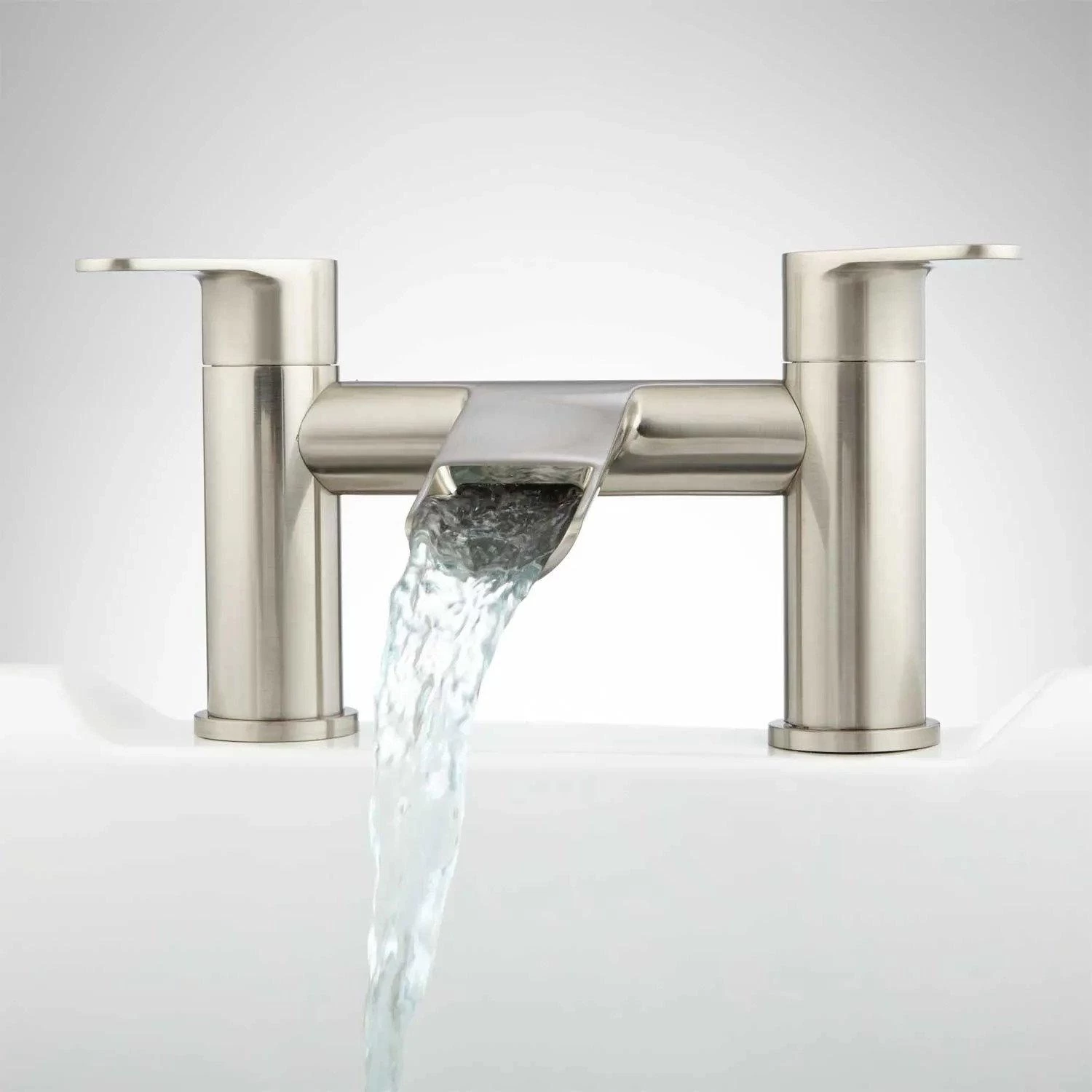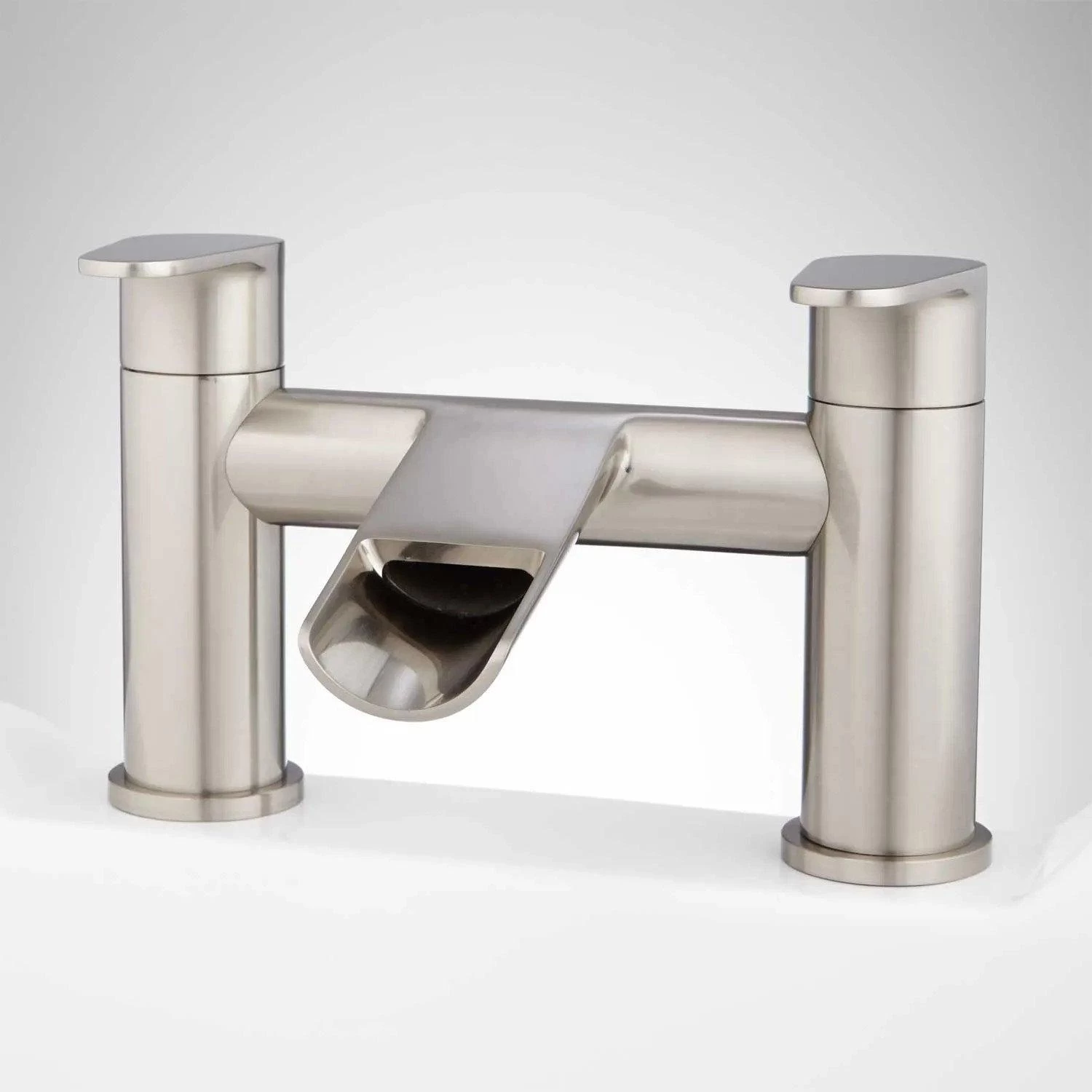 The Pagosa Waterfall Deck-Mount Tub Faucet has a unique design that connects the handles and the spout. With its solid construction and modern design, this product is perfect for a sleek bathroom.