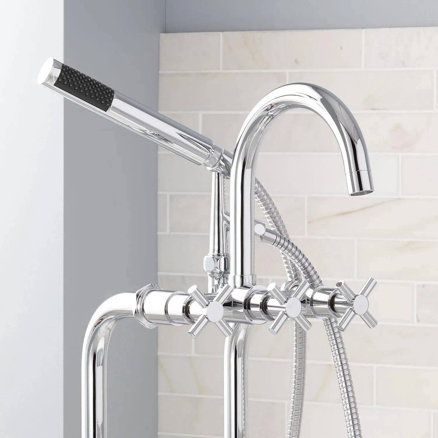 Featuring modern, cylindrical cross handles, The Sebastian Freestanding Tub Faucet will add a stylish and contemporary look to your bathroom.