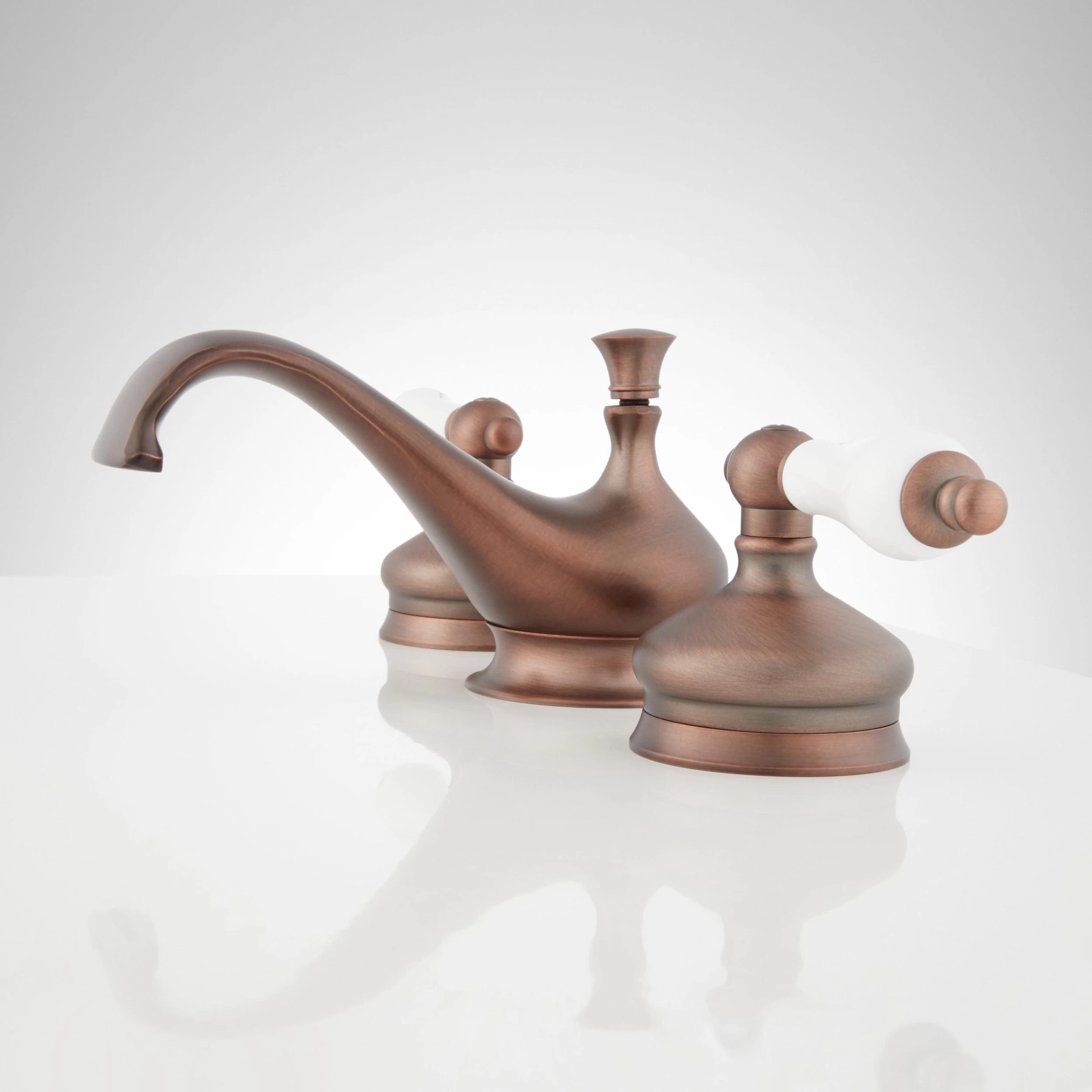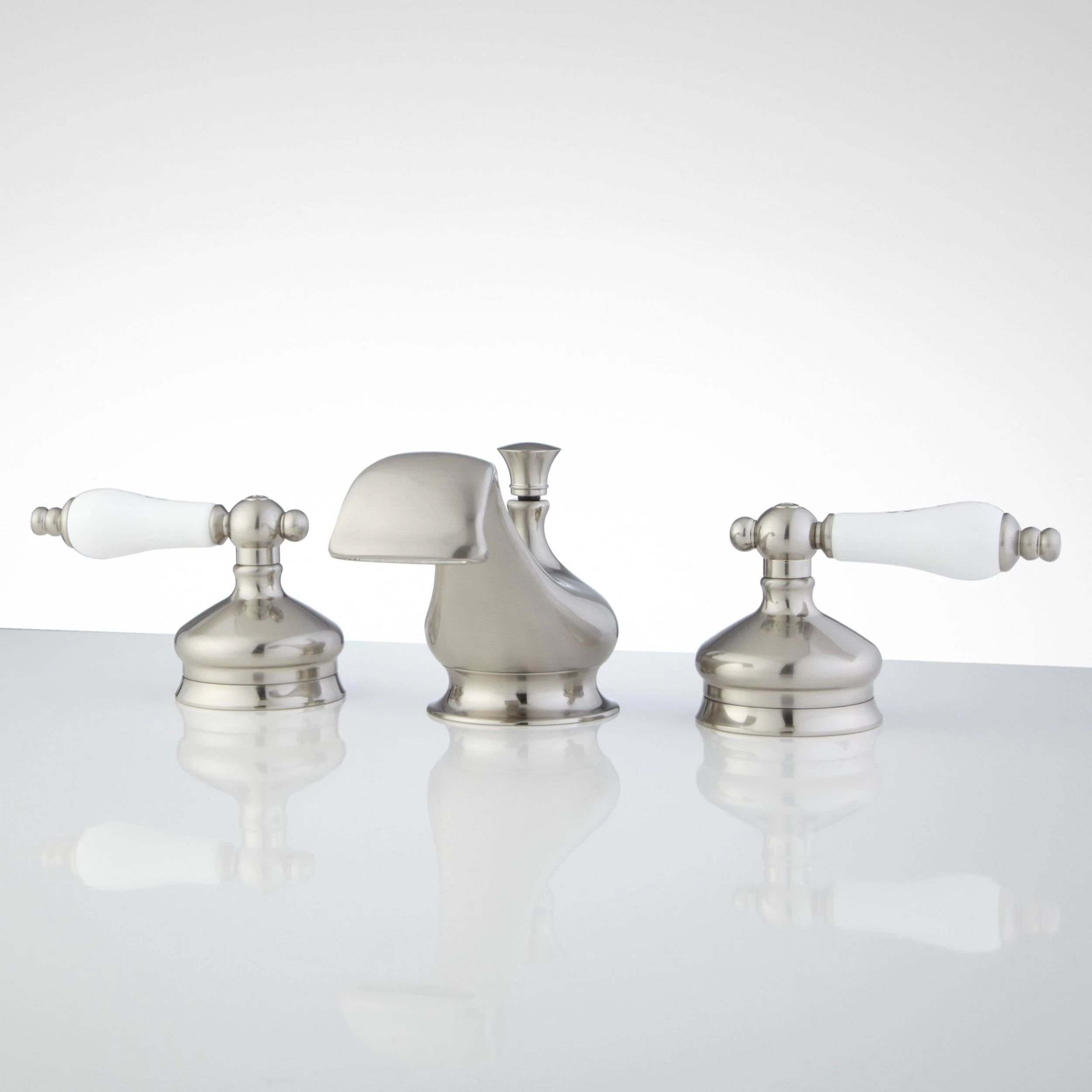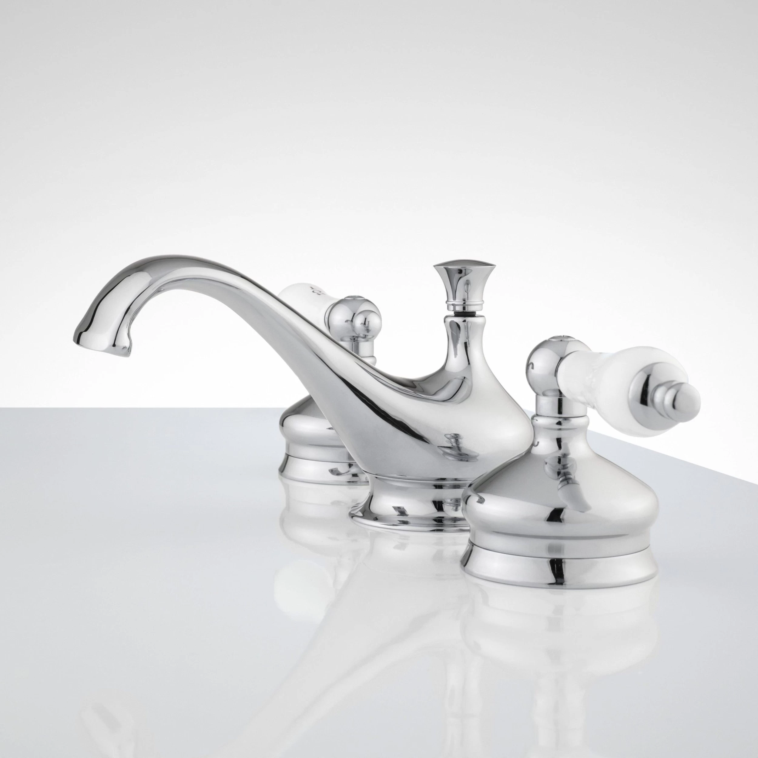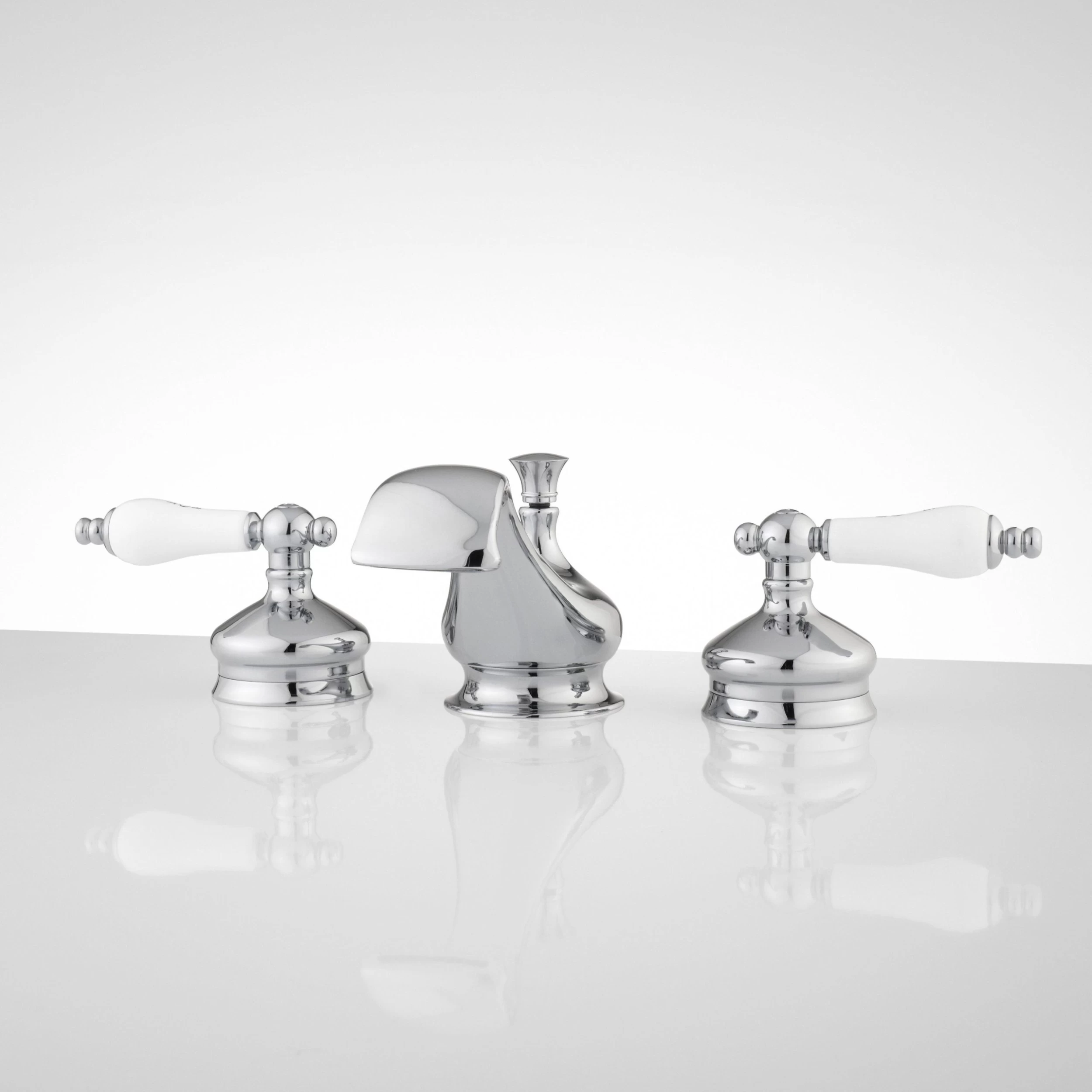The unique spout shape of the Shannon Widespread Bathroom Faucet will make it the focal point of your vanity or pedestal sink. Construction with high quality materials guarantees lasting durability. The large, classic porcelain handles contribute to the traditional design of this bathroom faucet.